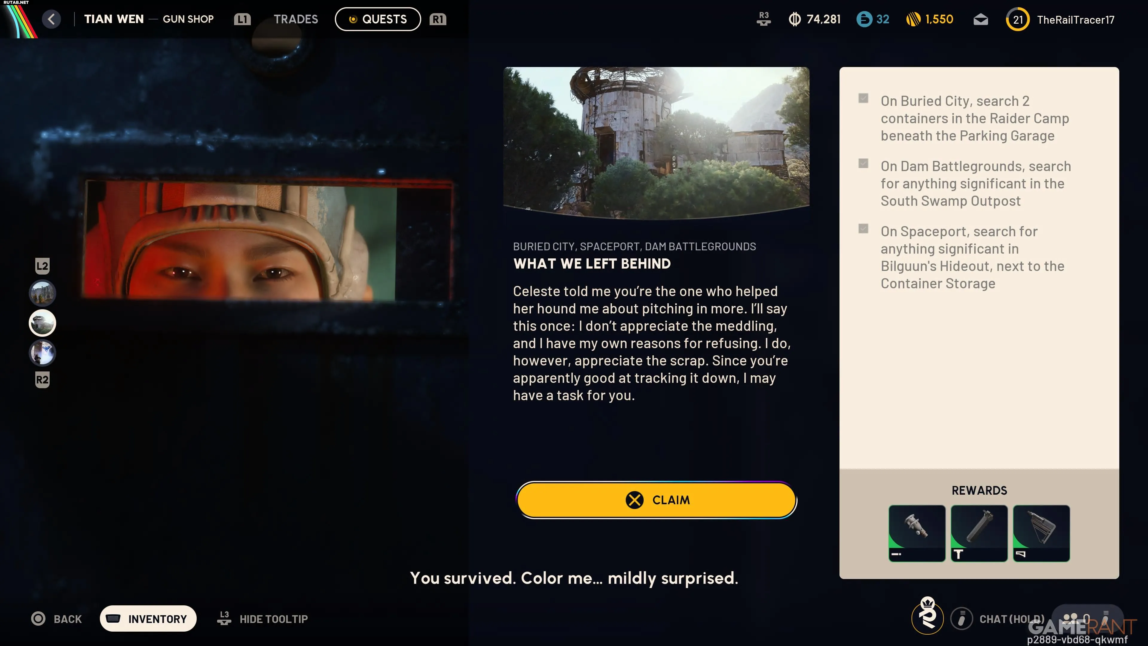 Квест состоит из трёх целей, для выполнения которых вам потребуется запустить миссии на локациях «Поле боя у дамбы», «Захороненный город» и «Космопорт». Для этих вылазок не требуется брать с собой какие-либо предметы, поэтому вы можете использовать бесплатную экипировку, чтобы не рисковать своими вещами.