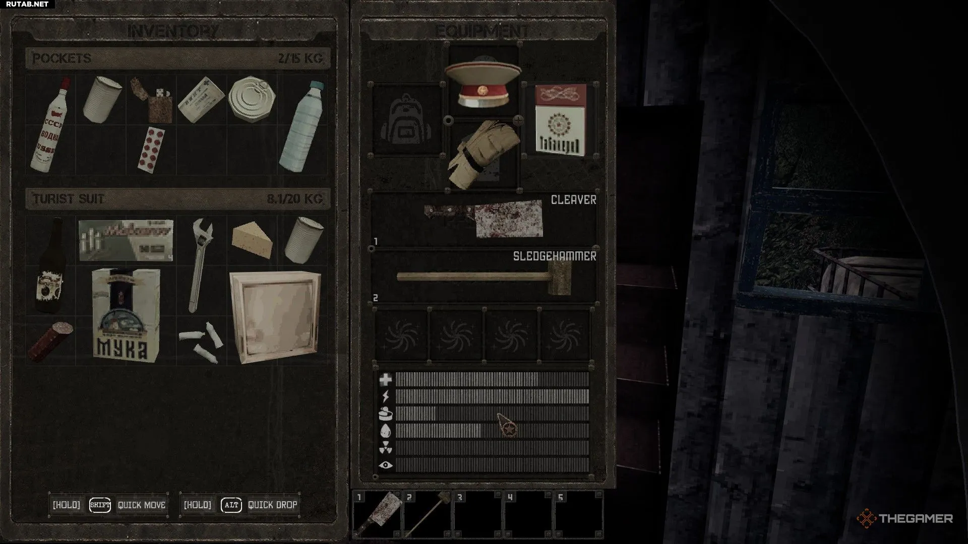 Однако есть ещё два параметра, которые видны только в инвентаре — Голод и Жажда. Они не всегда на виду, поскольку менее критичны, но если не проверять их периодически, возникнут проблемы. Низкие уровни голода и жажды будут медленно снижать здоровье и нарушать восстановление энергии.