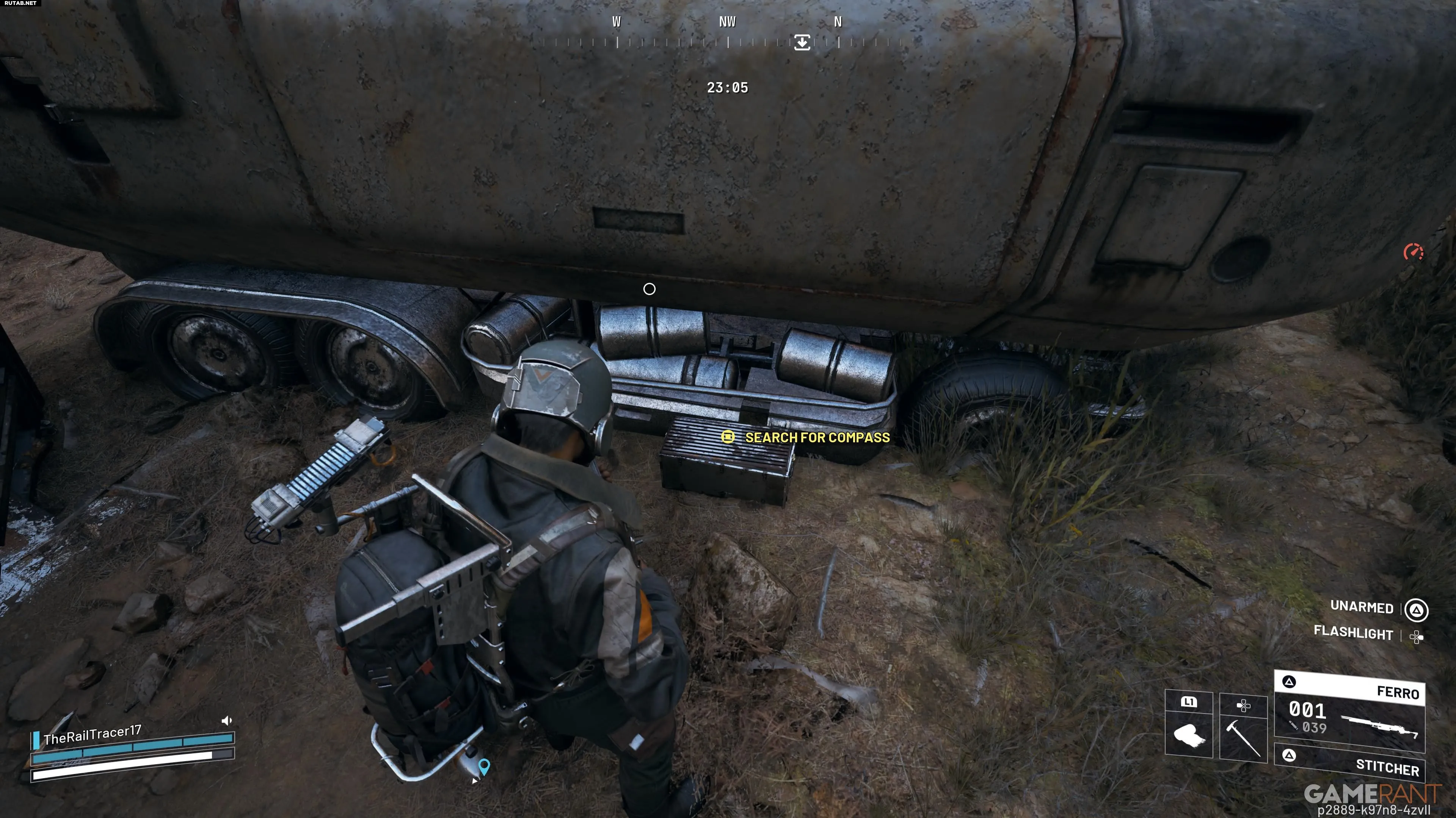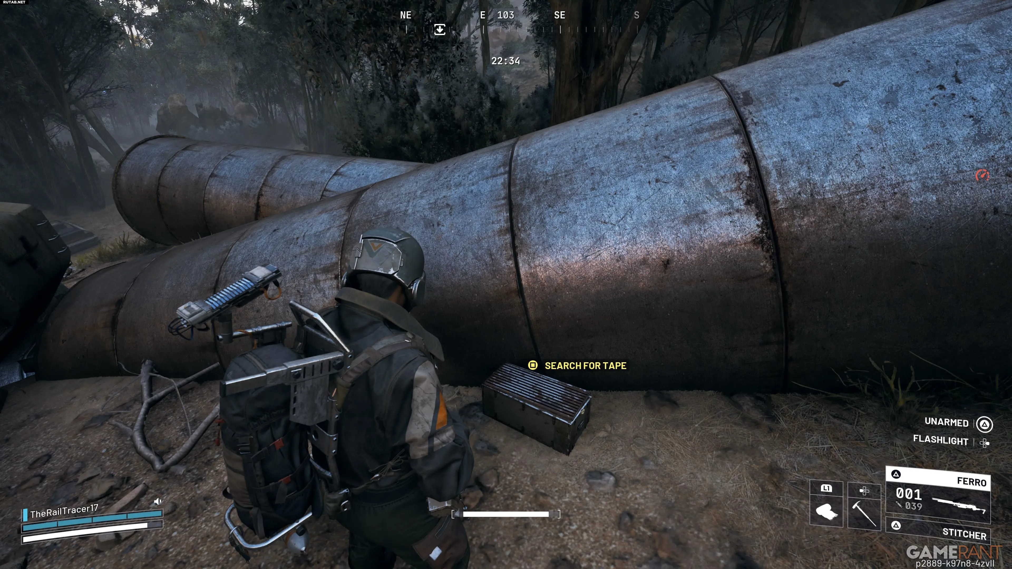 Далее нужно найти видеокассету. Она расположена к северо-востоку от компаса. Вы увидите два больших цилиндрических металлических объекта на земле, а рядом — небольшой контейнер с кассетой. Точка находится над буквой «a» в названии Scrap Yard.