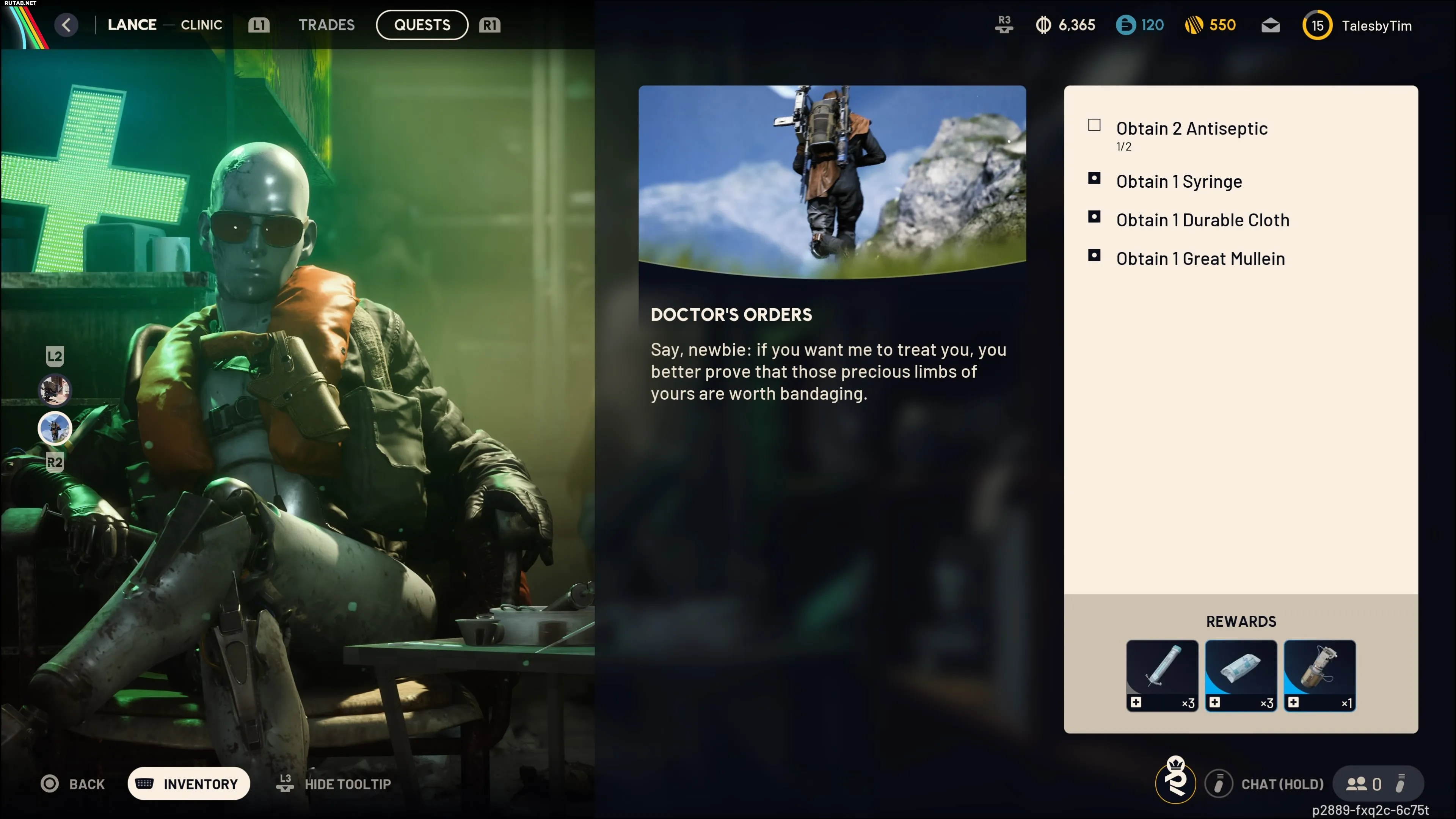 Собрав все необходимые материалы, отнесите их Лэнсу в его клинику через вкладку торговцев и завершите задание. В награду вы получите: