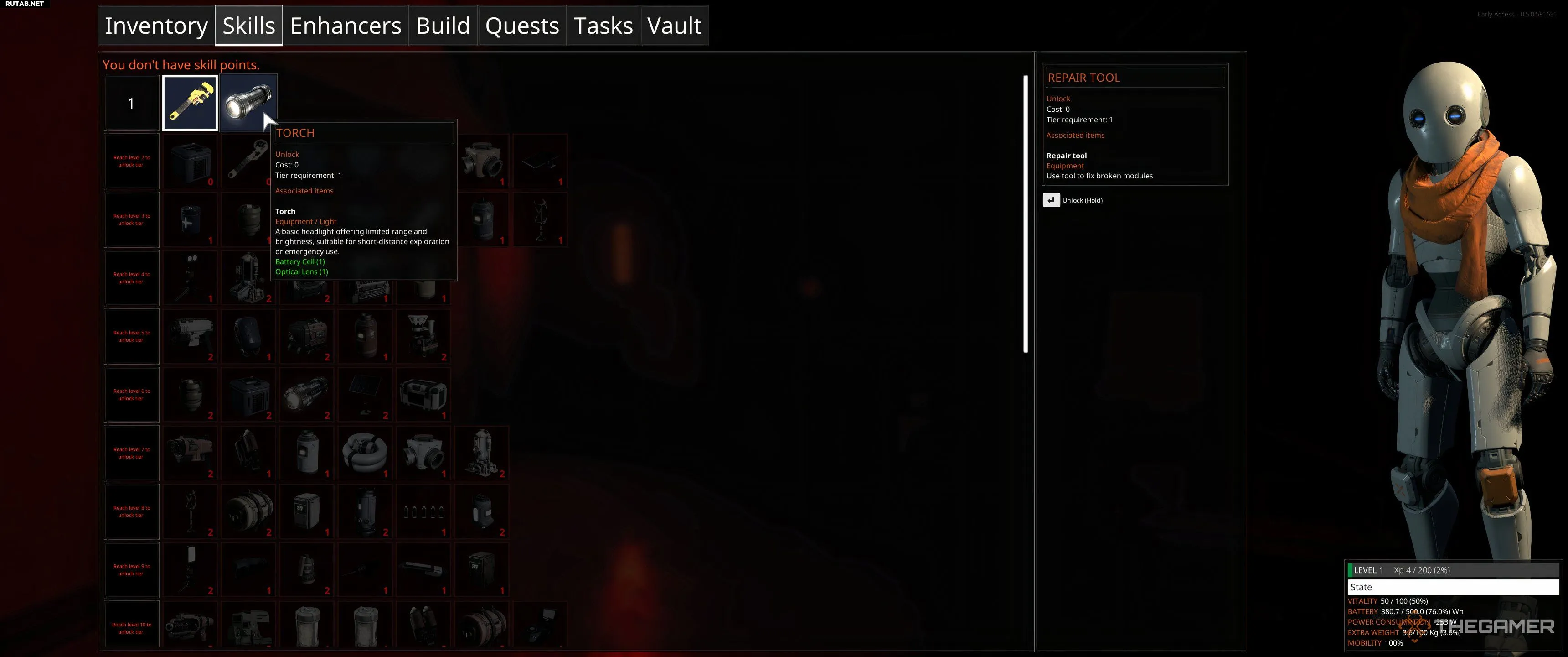 Название «навыки» несколько обманчиво — по сути, это чертежи или рецепты. Существует 21 уровень навыков, и каждый содержит от двух до восьми новых чертежей. Для разблокировки каждого потребуются очки навыков, но их не всегда хватит на все доступные чертежи при достижении нового уровня. Поэтому полезно знать, что доступно на каждом уровне.