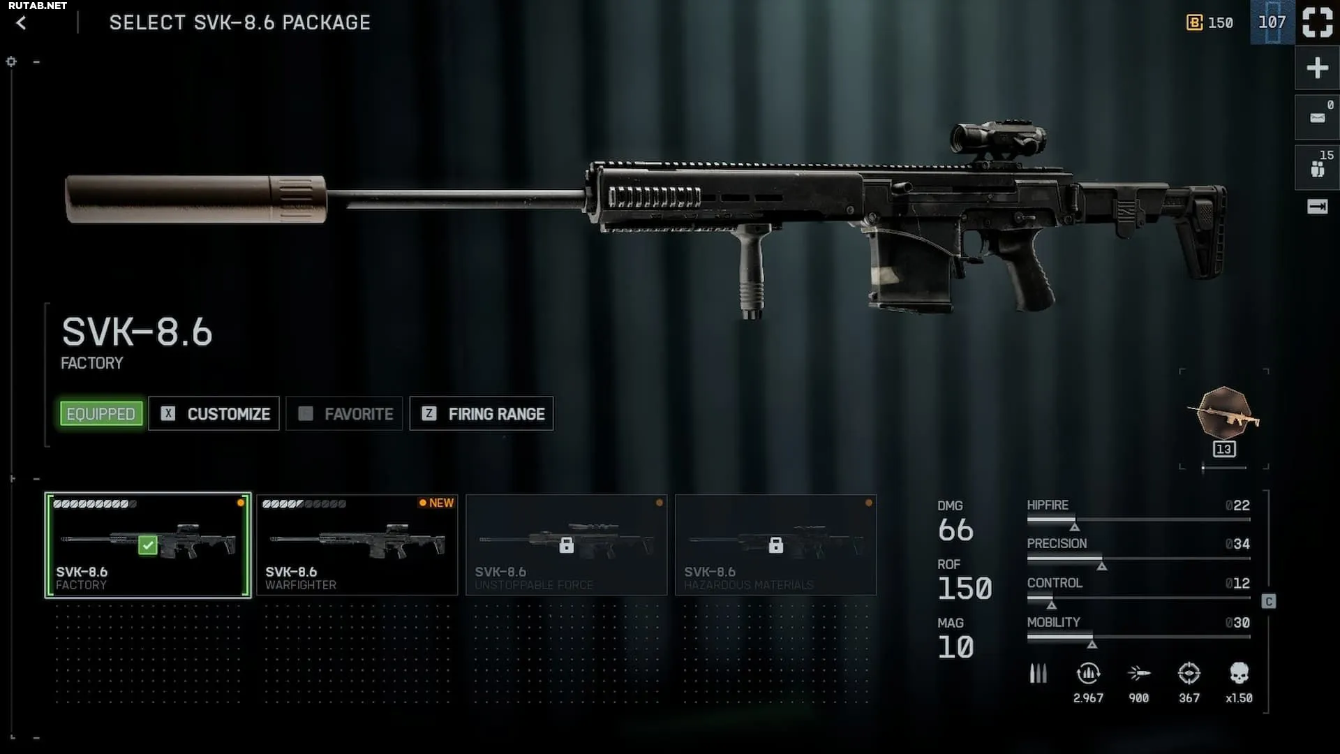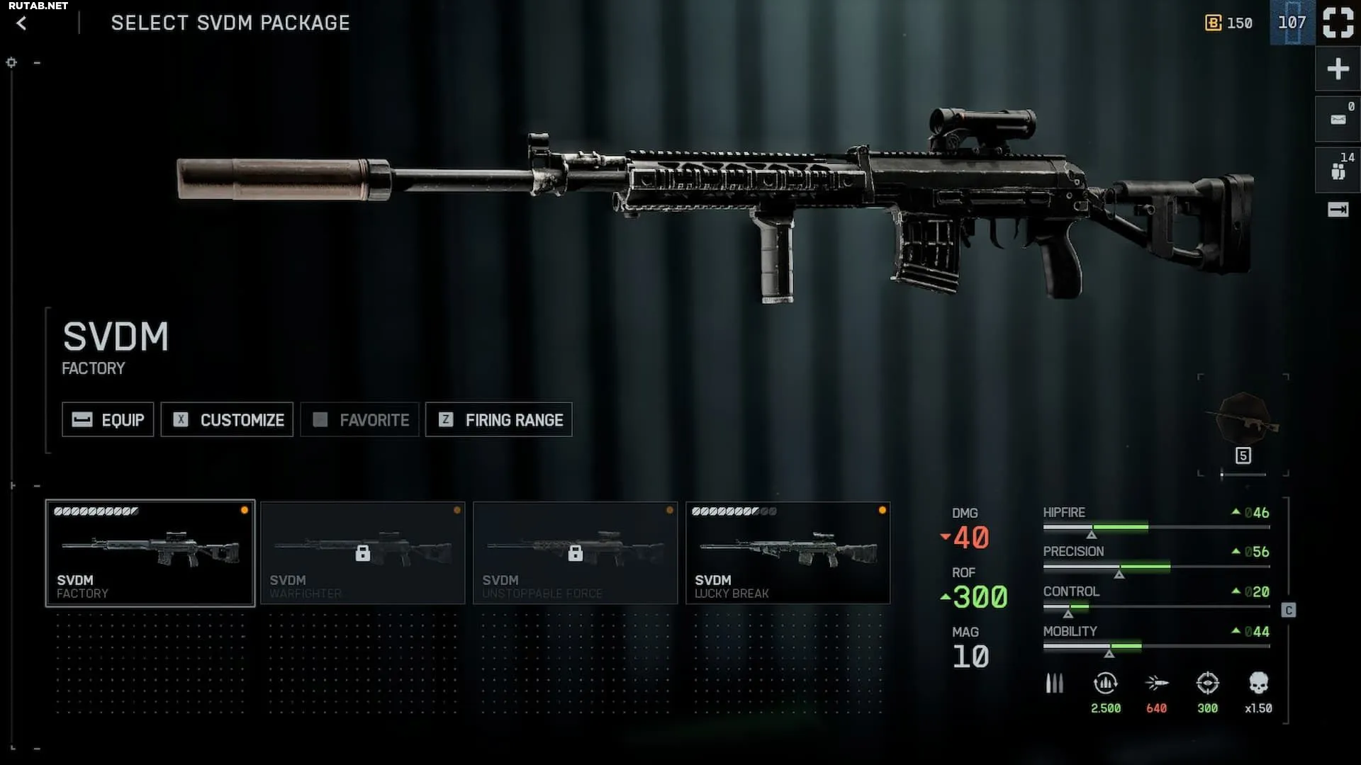 В отличие от SVK, у SVDM неплохая базовая точность стрельбы от бедра и в целом немного лучшая управляемость. Она выручит в критической ситуации, когда противник атакует вас в ближнем бою, но учитывая небольшой стандартный магазин на 10 патронов, у вас не будет права на ошибку. Впрочем, ёмкость магазина можно увеличить, и если собрать сборку на максимальную точность от бедра, SVDM можно использовать более агрессивно, делая её отличным выбором для всех карт, кроме самых маленьких.
