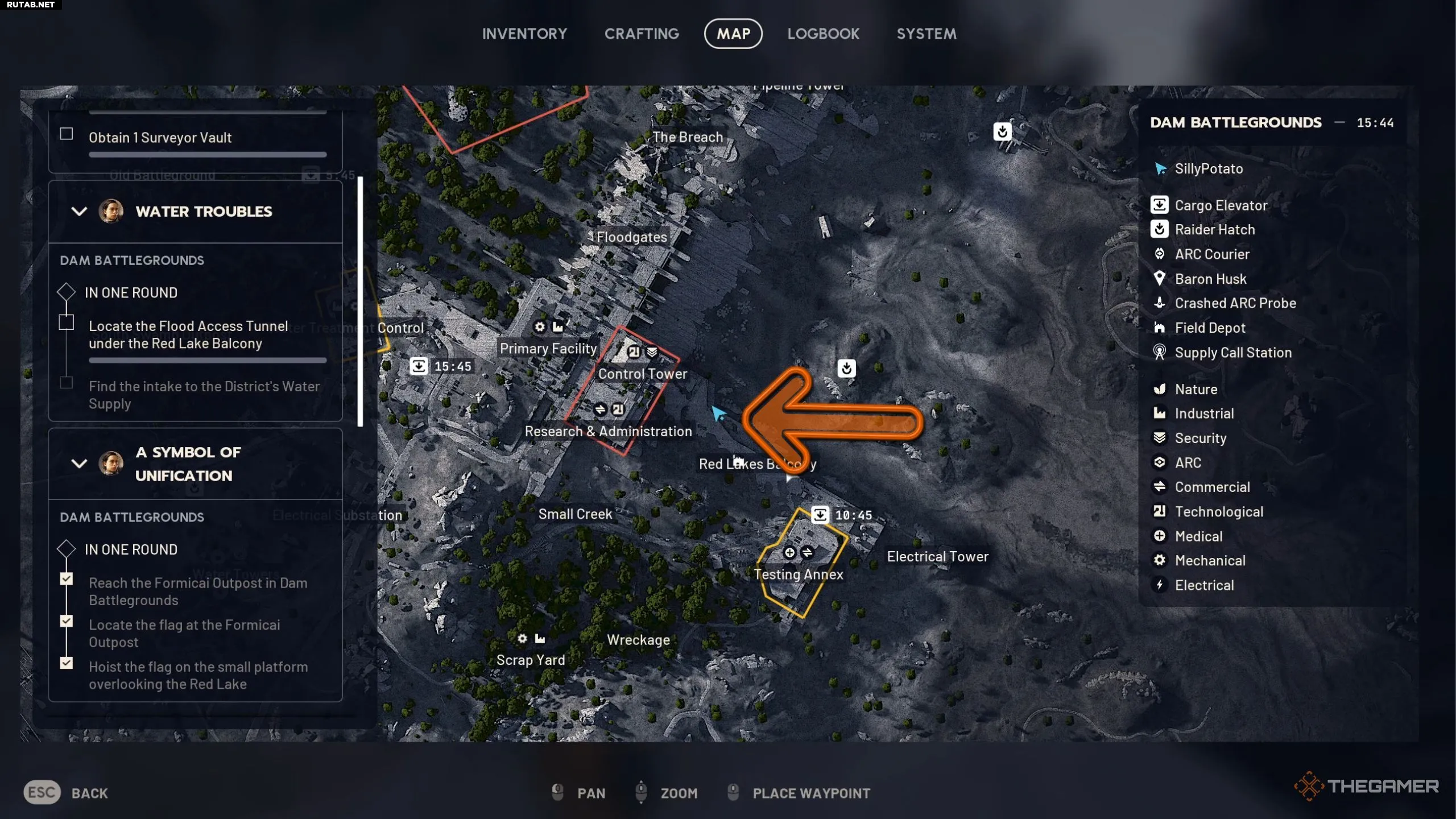 Получив квест «Проблемы с водой», вы сначала получите задание добраться до тоннеля доступа к паводковым водам под Красной озерной террасой. Эту террасу можно найти, приблизив карту восточной части Поля битвы у Дамбы, чуть выше зоны Испытательного крыла. Чтобы попасть в тоннель, сначала нужно спуститься ближе к красному озеру внизу.