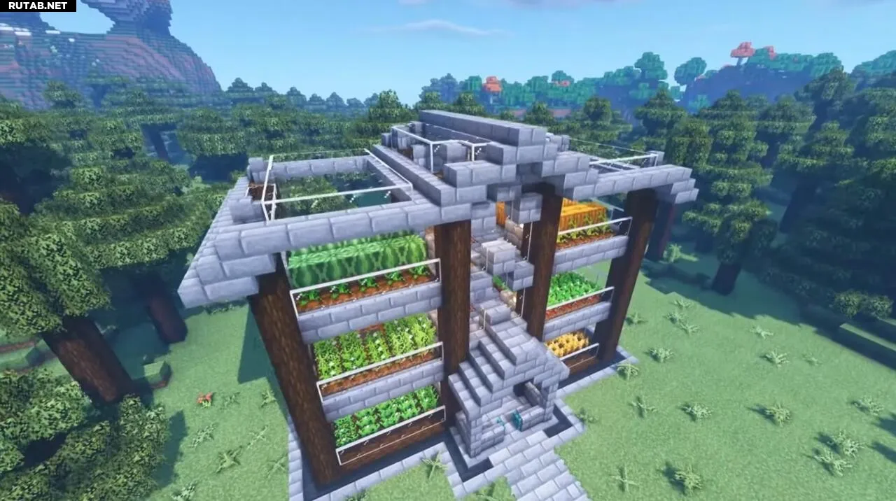 Первой в нашем списке идёт многоуровневая ферма для ростков с автоматизированной системой сбора, чтобы вам не приходилось вручную обходить и собирать каждый росток по отдельности. Эта ферма не только выглядит впечатляюще благодаря прозрачным окнам, через которые видно ростки снаружи, но и очень функциональна.