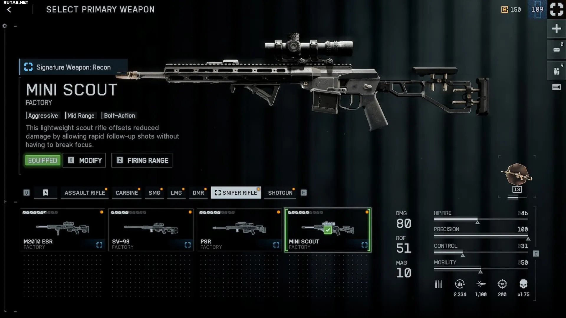 Mini Scout создана для агрессивных снайперов, предпочитающих постоянное движение вместо статичной позиции. Такой стиль игры обеспечивается высокой скорострельностью (51 выстр./мин), отличной начальной скоростью пули (1100 с удлинённым стволом) и встроенным механизмом перезарядки в прицеле. Mini Scout практически не требует модификаций для эффективности, но имеет два недостатка.