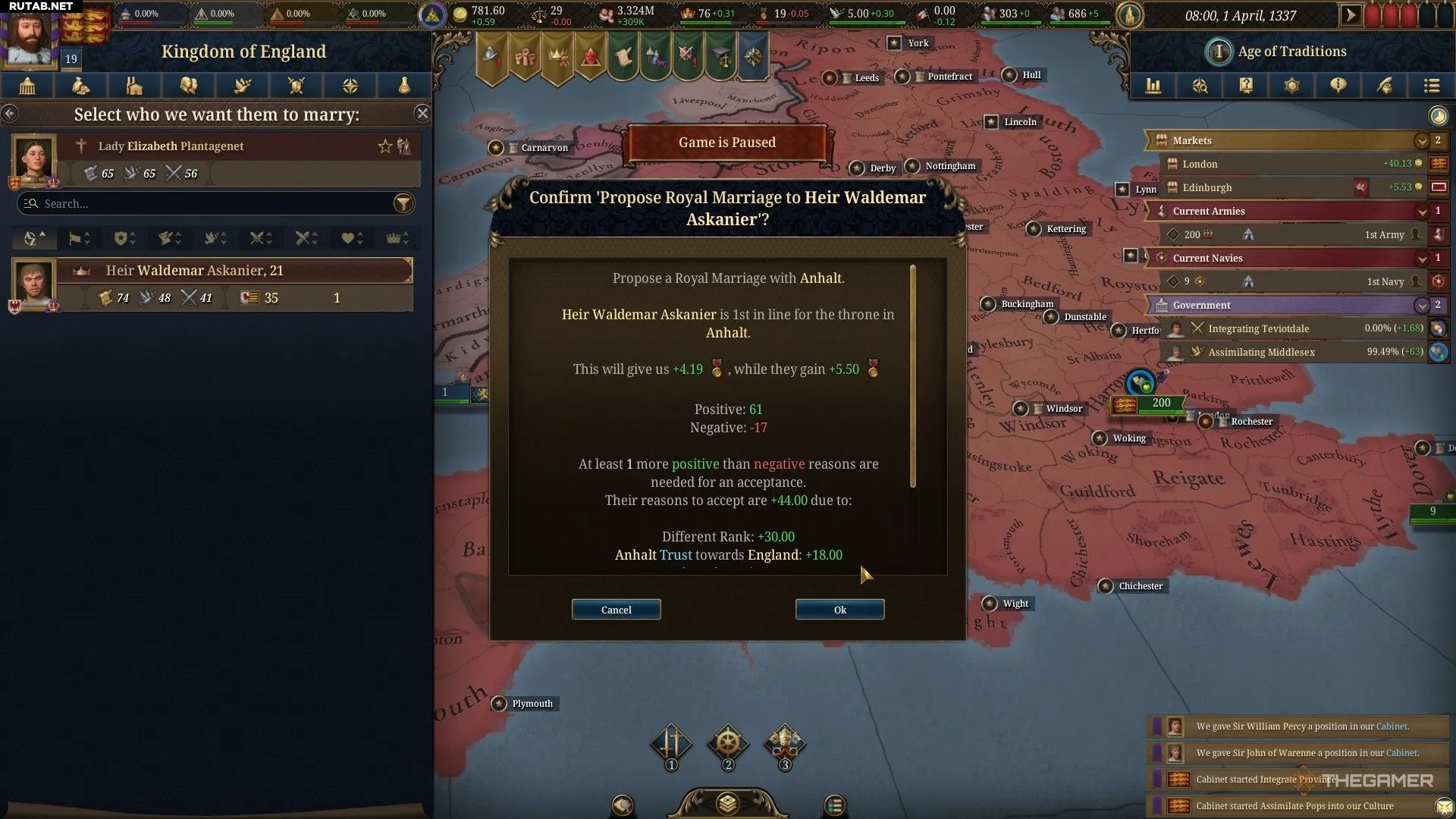 - Заключение династического брака с уважаемой страной, чей престиж достаточно высок, чтобы добавить очки к вашему показателю после заключения союза. Обе стороны взаимно влияют на престиж друг друга через брак, причём величина влияния отображается до принятия решения.