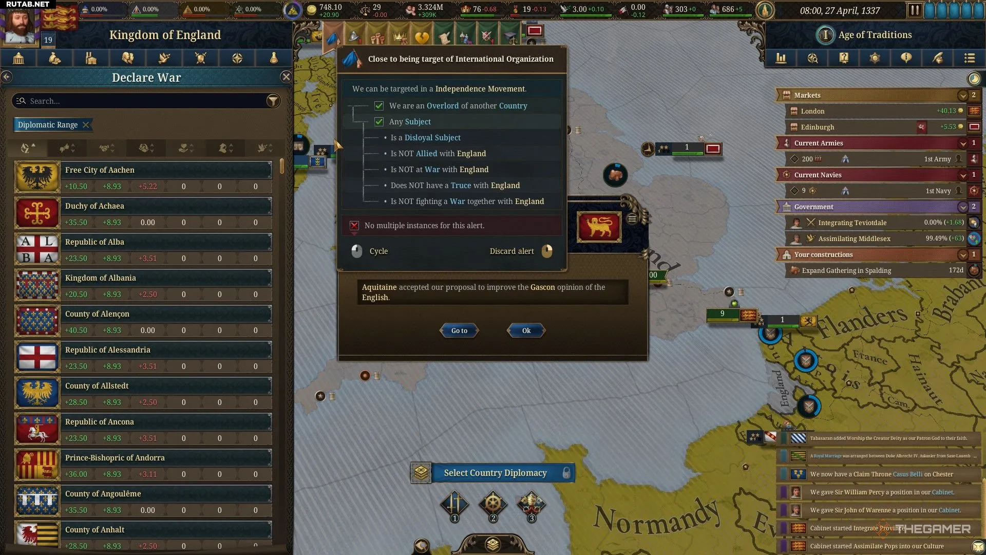 Также вы можете развивать территории, которые вы захватили в рамках миссии расширения. Уровень антагонизма будет снижаться по мере того, как вы улучшаете захваченные земли, демонстрируя другим странам, что вы не такой уж плохой правитель. Отказывайтесь от любых споров, в которых они могут участвовать, чтобы поддерживать низкий уровень антагонизма.