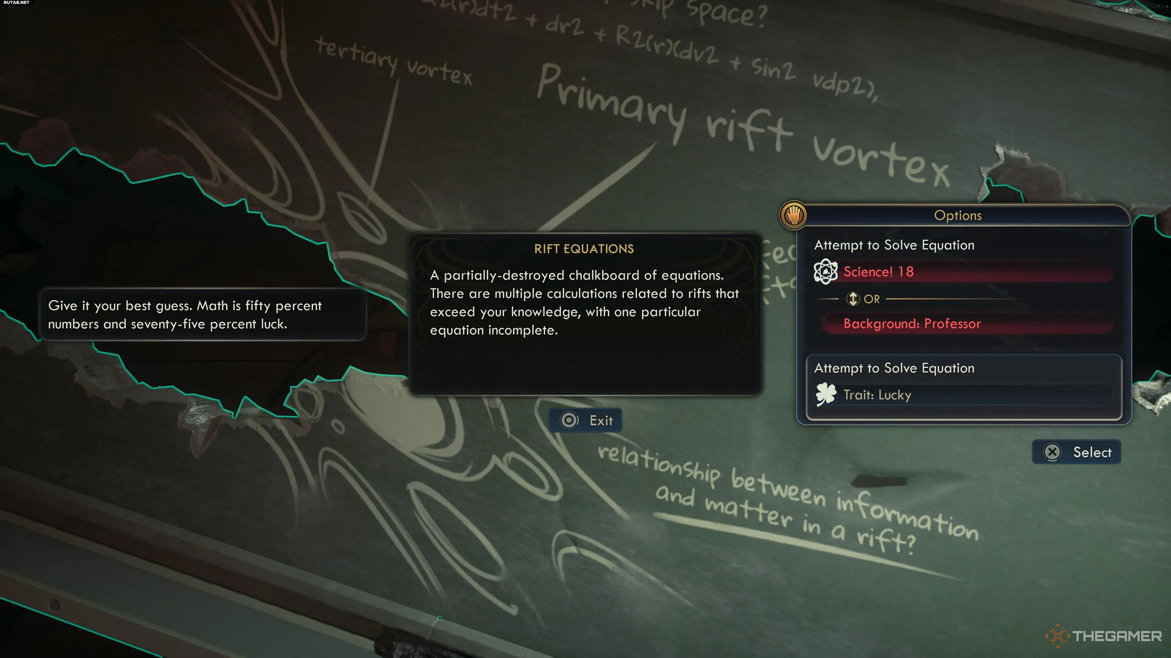 Если у вас навык «Наука» 18, происхождение «Профессор» или черта «Удачливый», вы можете найти наверху доску, которая позволит вам вывести уравнение. Если сможете, вернитесь вниз и деактивируйте Разлом через терминал. Если нет, придётся пройти немного дальше, чтобы найти личную комнату Суверена, где вы обнаружите доску с уже полностью решённым уравнением.