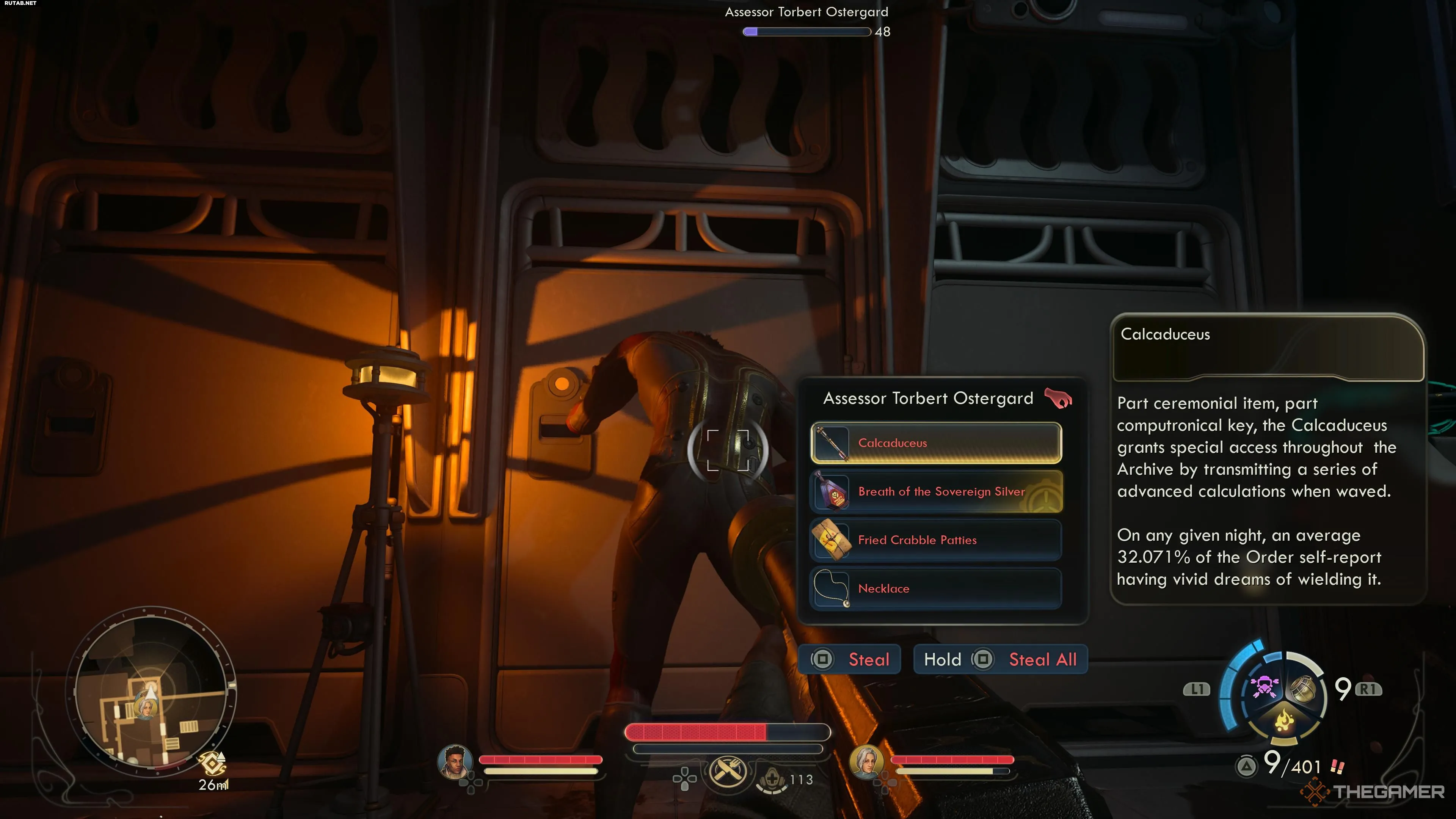 Вы можете просто подойти и вытащить Калькадуцей из его кармана, оставив его в покое, или поговорить с ним и попытаться убедить добровольно отдать артефакт. Также можно сообщить, что уже украли Калькадуцей, на что он ответит, что вынужден сражаться, поскольку Протекторат убьёт его за потерю. В любом случае, теперь артефакт у вас, а с ним и контроль над Архивом.