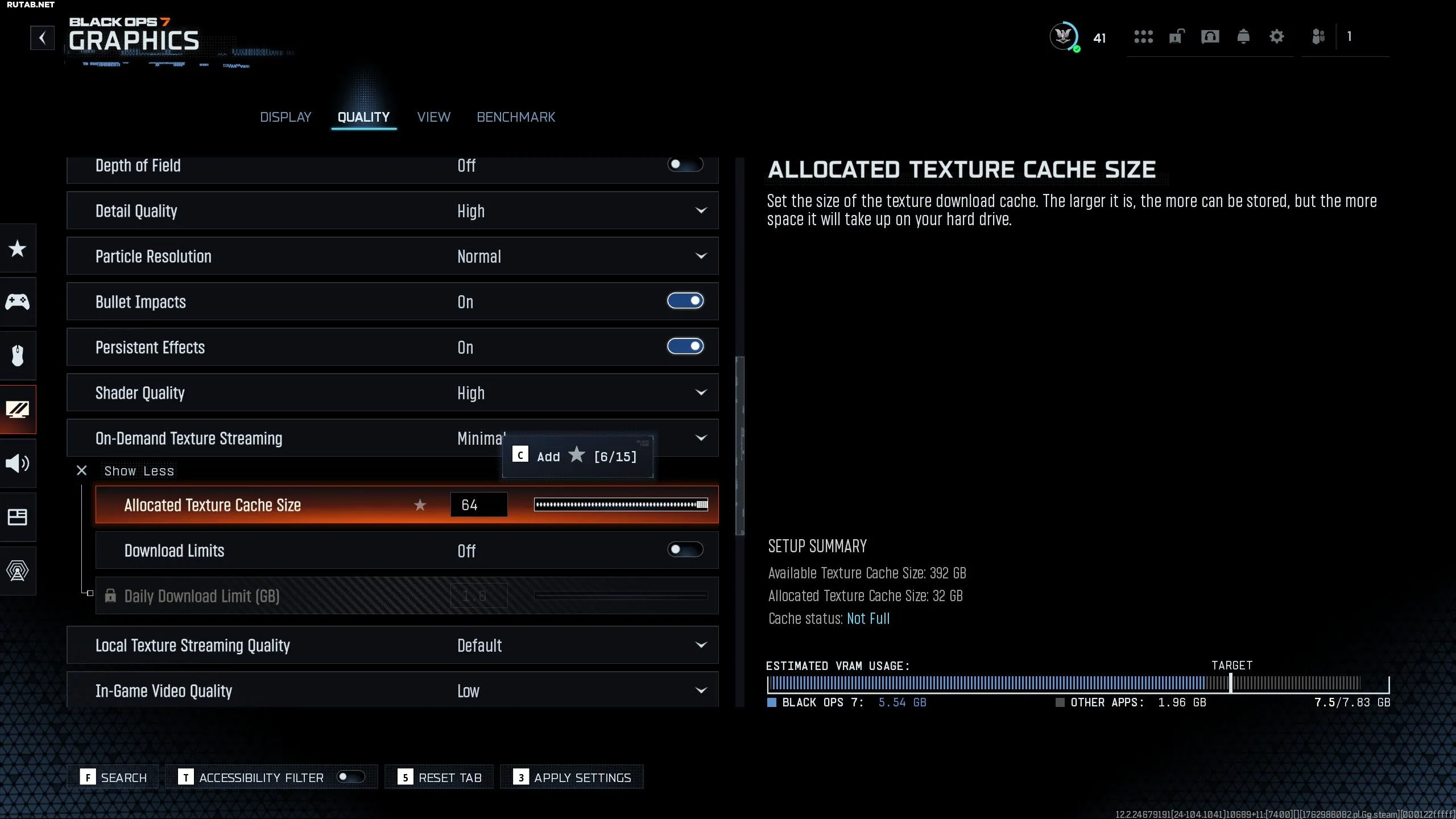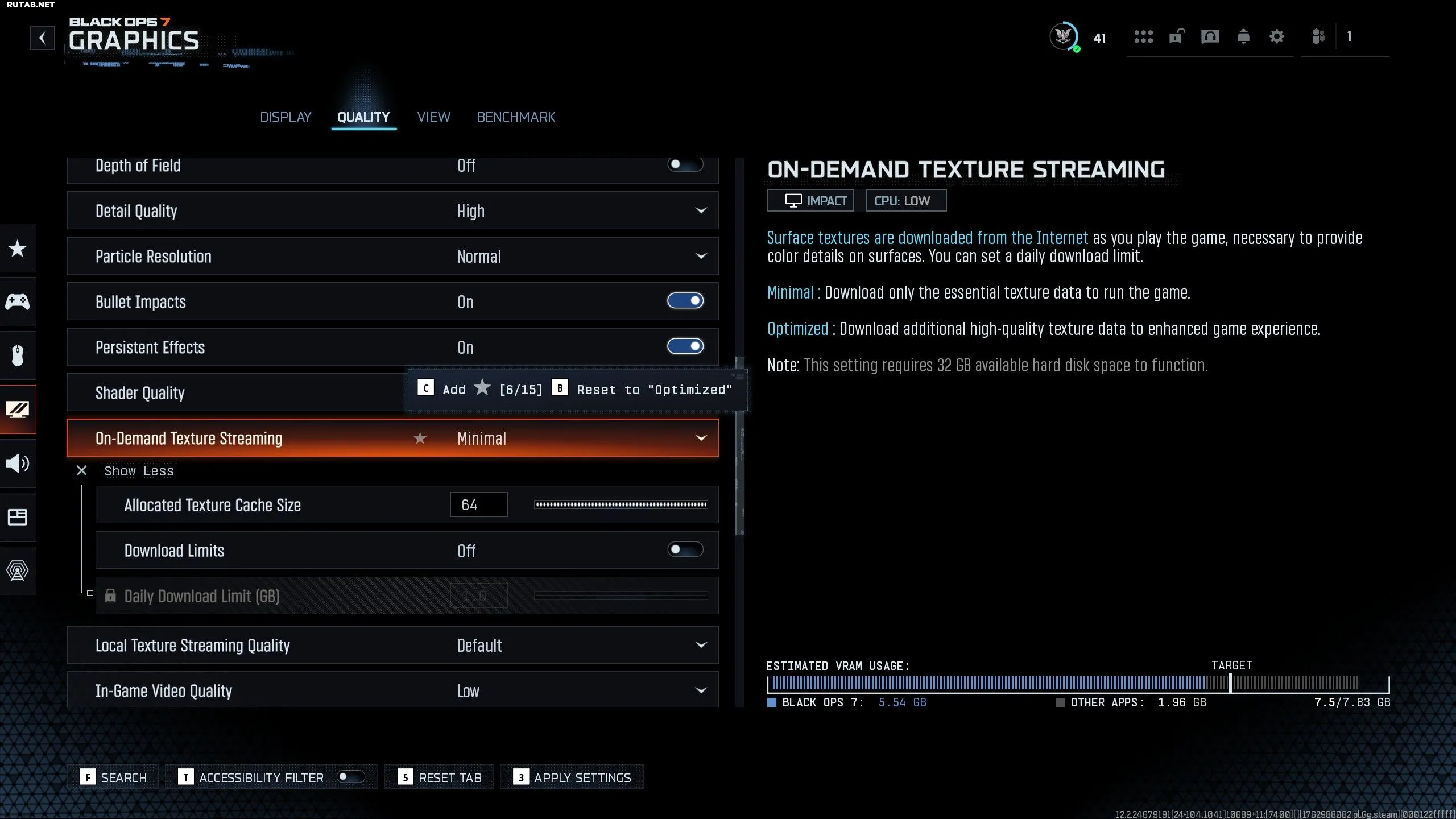 Один из самых эффективных методов — установить параметр «Потоковая передача текстур по требованию» на «Минимально». Эта функция загружает текстуры из интернета во время игры, но может вызывать пакетный всплеск. Установите минимальное значение, чтобы загружались только essential текстуры. Также можно увеличить размер кэша текстур: