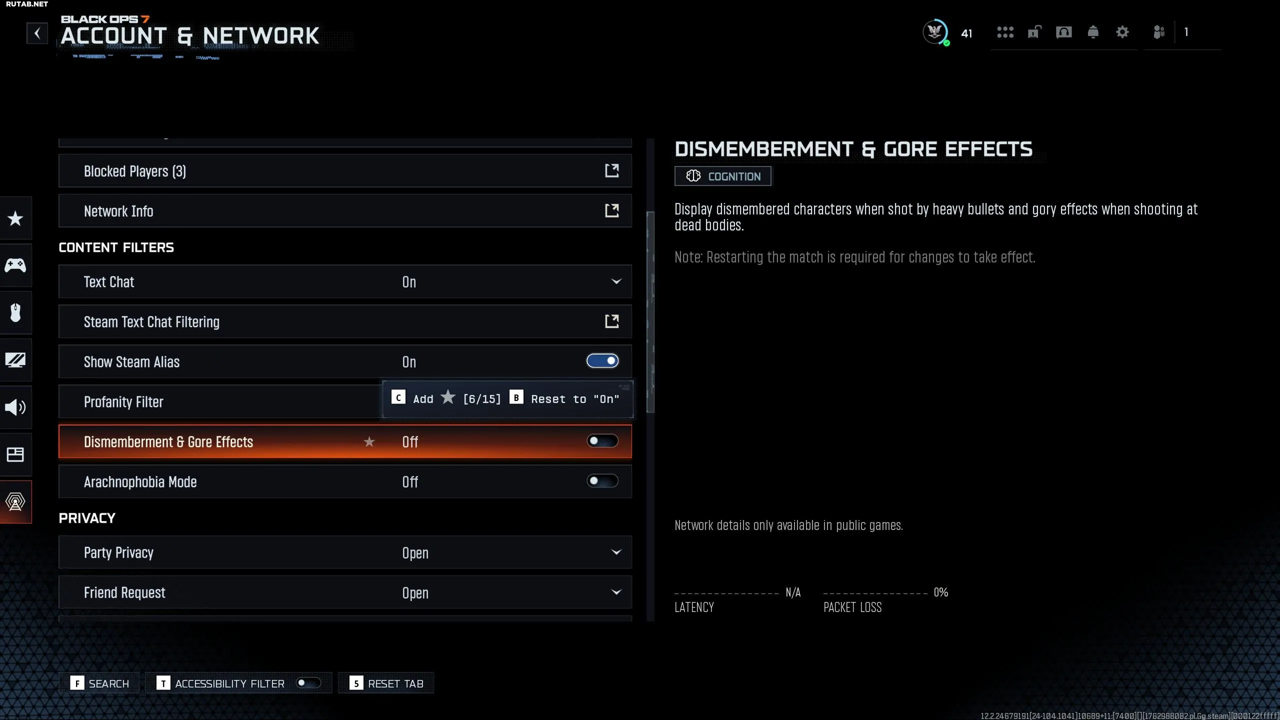 Неожиданно, но эффекты расчленения и крови могут влиять на потерю пакетов. Вероятно, это связано с перегрузкой данных при отображении детализированных сцен. Попробуйте отключить эту опцию: