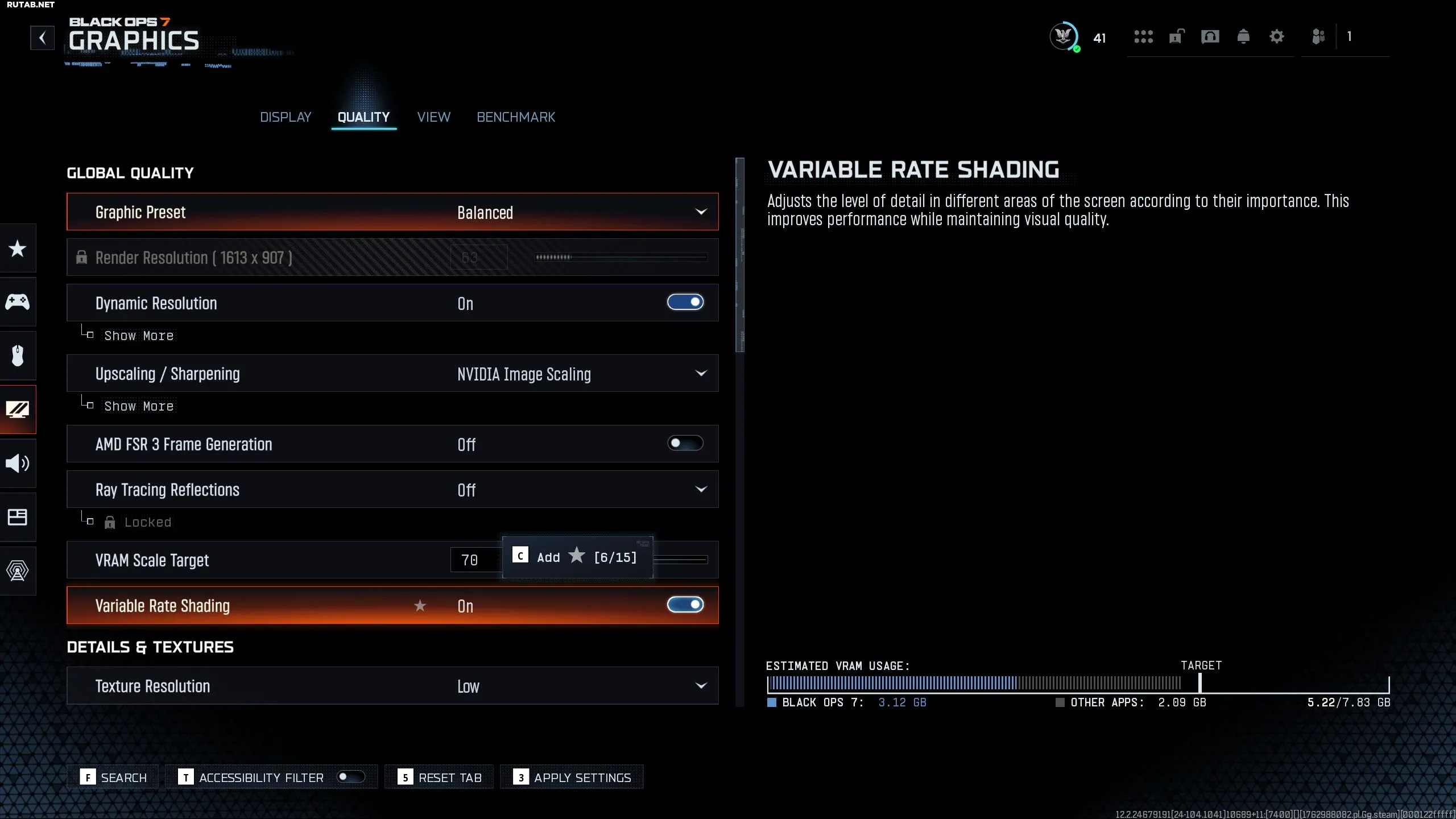 Параметр «Целевой масштаб VRAM» устанавливает процент видеопамяти, который может использовать игра. Слишком высокое значение может вызвать подвисания. Также включите «Переменную затеняющую скорость» (VRS), которая улучшает производительность, управляя качеством рендеринга: