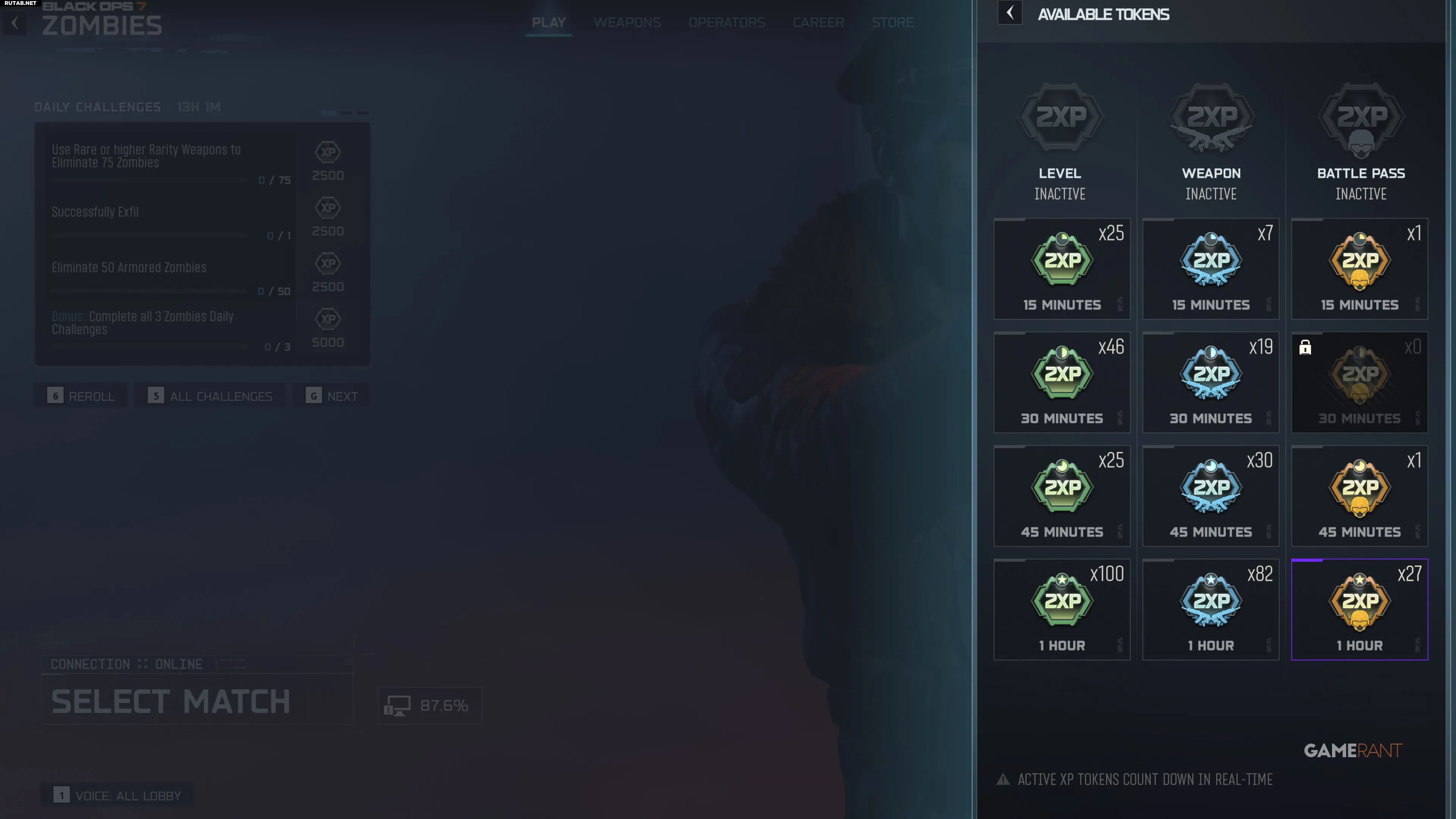 Жетоны двойного опыта в Black Ops 7 активируются так же, как и в Black Ops 6. Чтобы активировать их, найдите заработанные жетоны в правом нижнем углу главного меню, меню паузы или меню запуска и выберите соответствующую опцию, либо нажмите L3 на PlayStation, LS на Xbox или 3 на ПК. Затем выберите жетон, который хотите активировать.