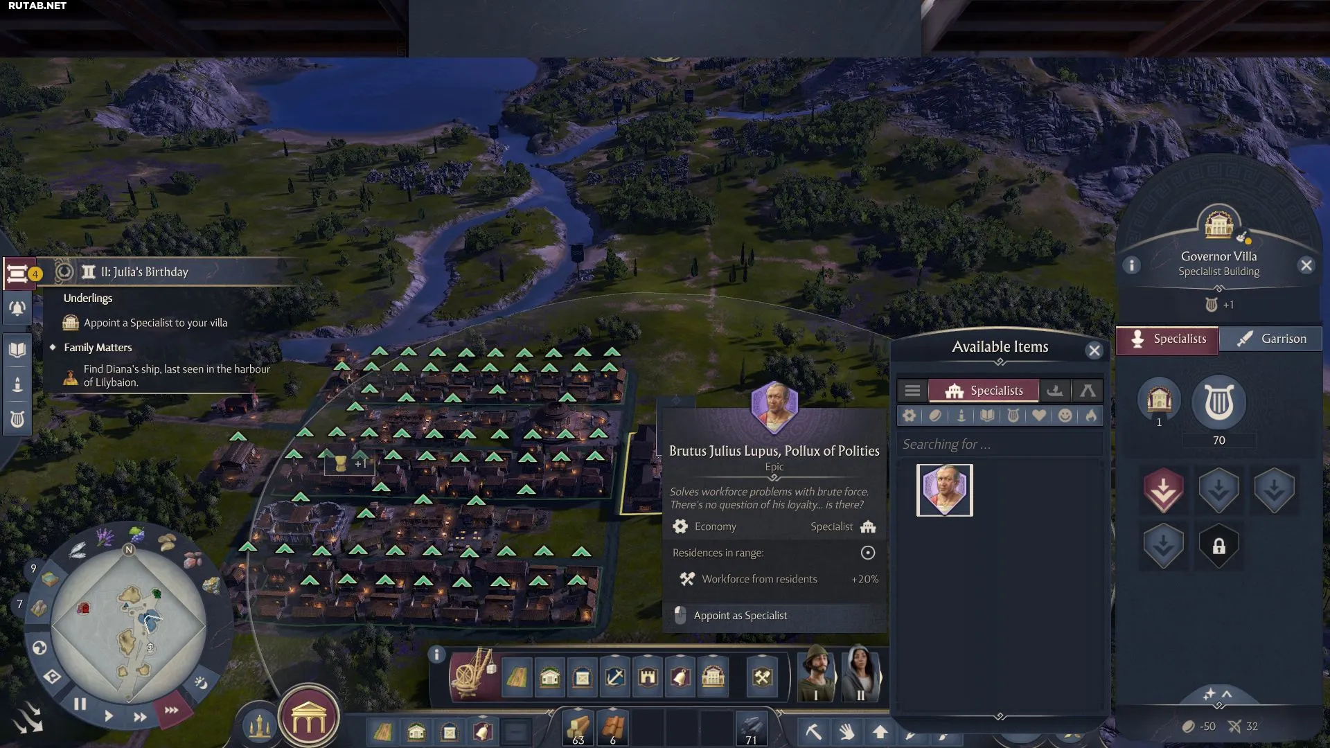 После получения специалиста его необходимо разместить в зоне, где он сможет влиять на окружающие постройки. Лучше всего устанавливать их в жилых районах, где здания расположены компактно. Универсальных специалистов, таких как Брут и Гай, рекомендуется размещать в вилле губернатора, тогда как для узкопрофильных помощников подойдет гостевой дом с меньшим радиусом действия.
