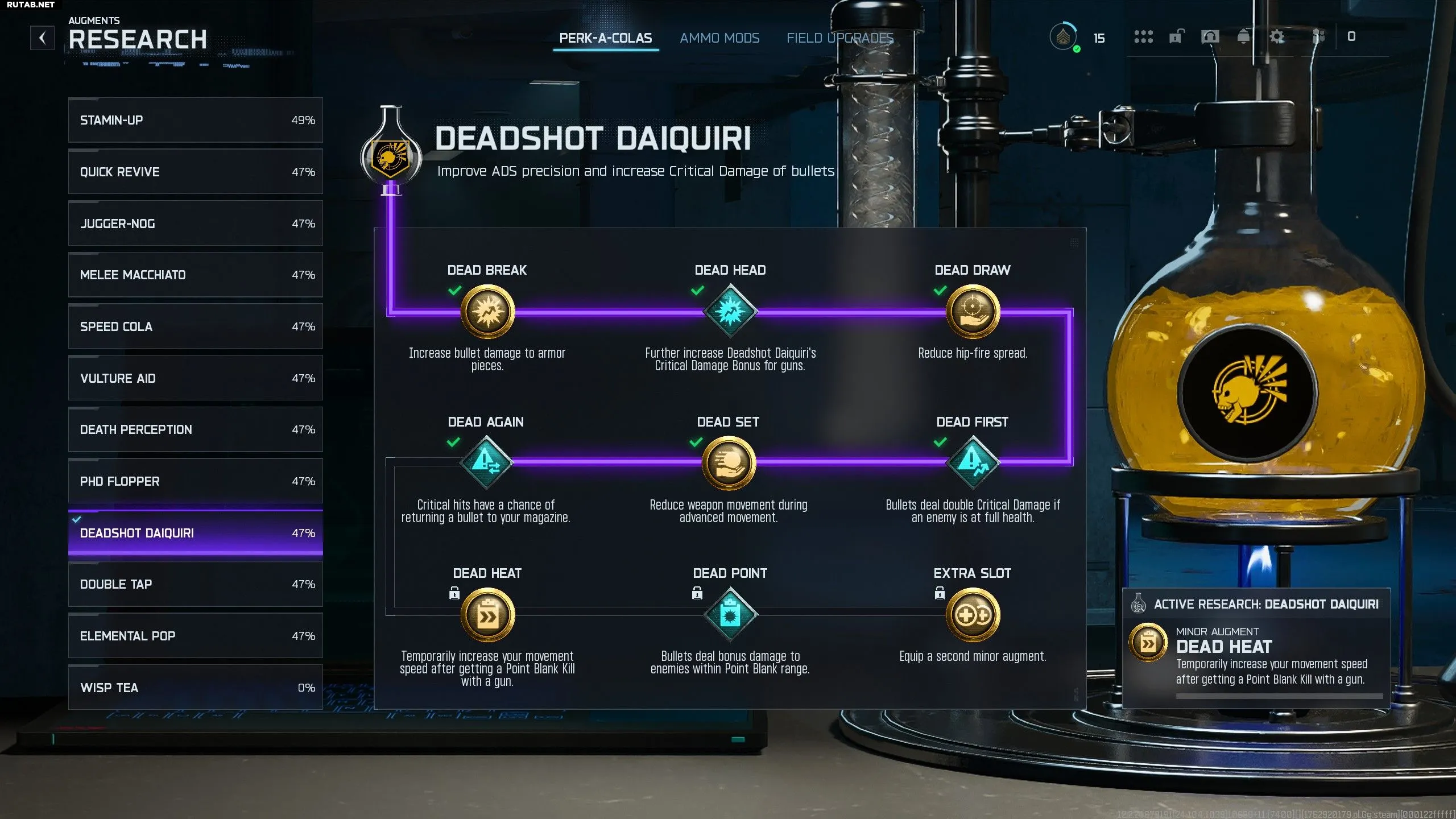 Повышение критического урона — это всегда приятно для метких стрелков, поэтому Мёртвая Голова является лучшим основным аугментом для Deadshot Daiquiri. Если вы используете дробовик или снайперскую винтовку, то двойной урон в голову первым выстрелом всегда будет смертельным, особенно против элитных зомби. В качестве второстепенного аугмента мы выбрали Мёртвую Точку, так как увеличение скорости передвижения после убийств в упор, которые часто случаются на высоких раундах (особенно с дробовиками), станет важным преимуществом для поддержания скорости выше, чем у орды.
