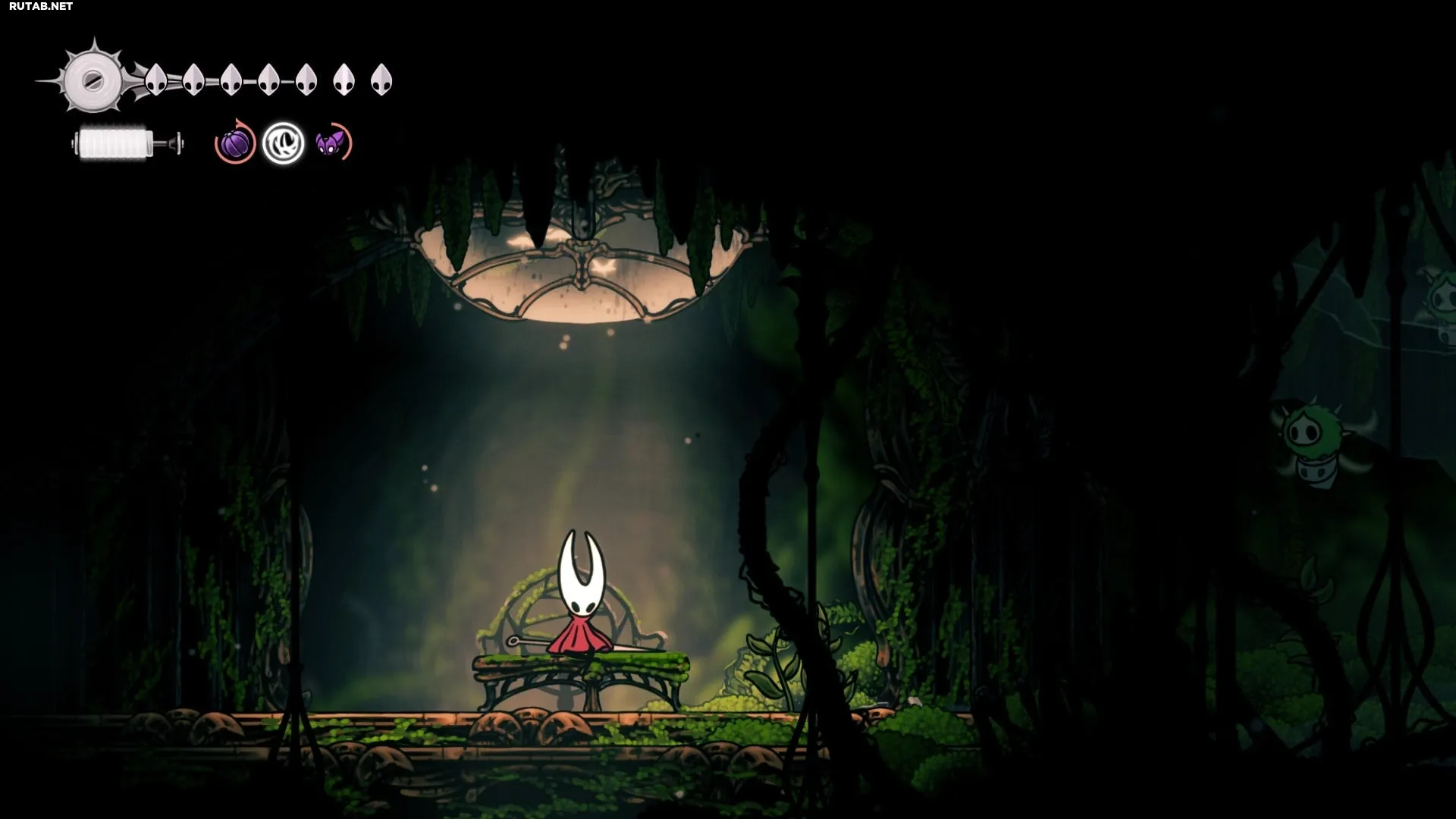 В следующей комнате держитесь левой стороны, пока не достигнете самого конца пути — по пути уничтожая лозы, которые преграждают дорогу — и вы быстро доберётесь до скамьи Мемориума.