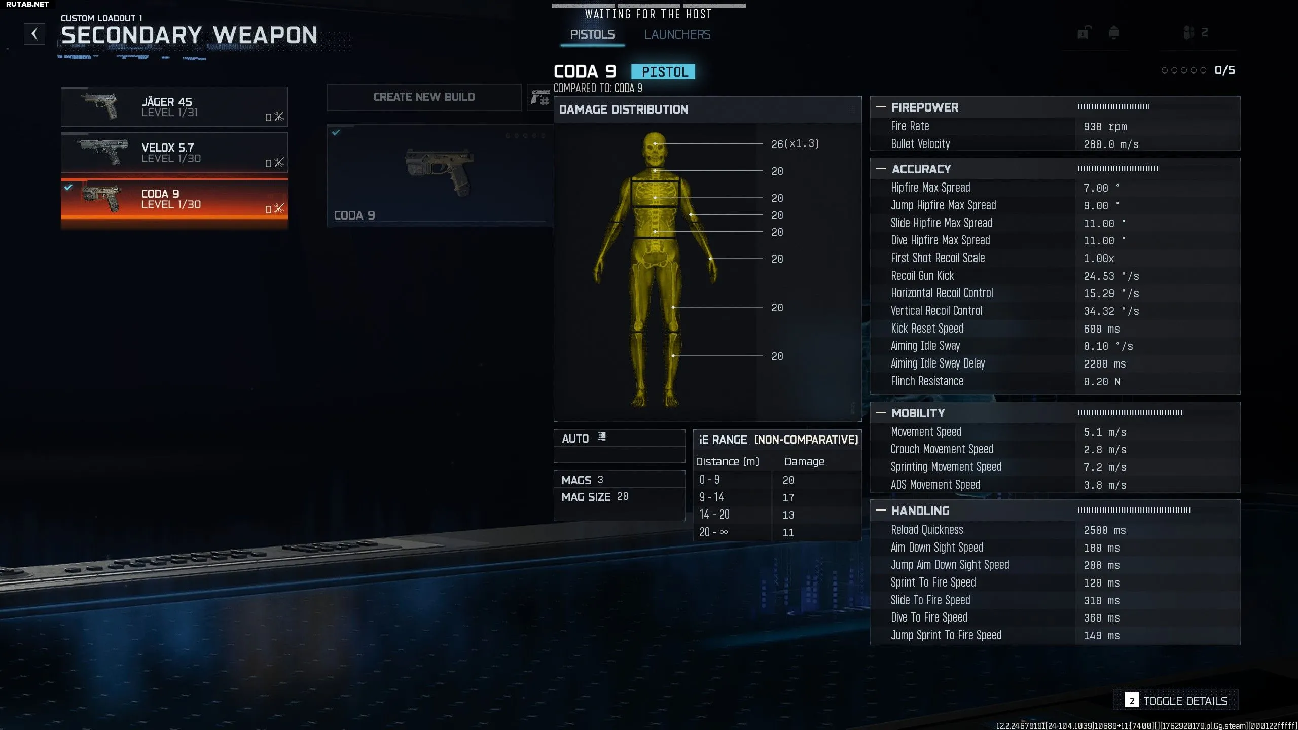 Этот пистолет отличается высокой скорострельностью благодаря автоматическому режиму стрельбы — можно просто удерживать спусковой крючок, чтобы устранить любого противника перед вами. Хотя магазин на 20 патронов может показаться щедрым, его всегда будет не хватать, поскольку CODA 9 расходует боезапас с невероятной скоростью. Отдача и эффективная дистанция оставляют желать лучшего, но переключение на этот пистолет в ближнем бою гарантирует вам победу даже в столкновениях с пистолетами-пулемётами.