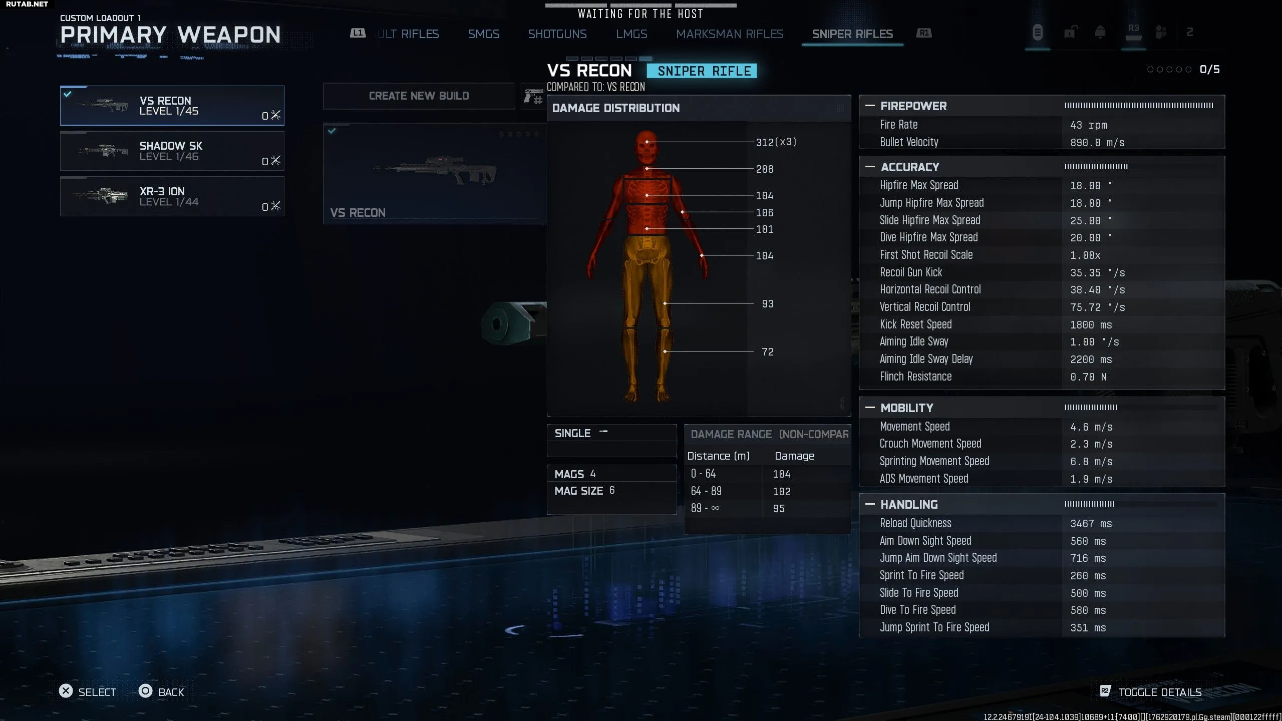 VS Recon обладает исключительной эффективностью — это оружие гарантирует убийство с одного выстрела в область от торса до головы. Благодаря столь щедрой зоне поражения игроки могут мгновенно устранять противников как с прицеливанием, так и без, а продольно-скользящий затвор обеспечивает достаточно быструю перезарядку. Магазин вмещает 6 патронов, что гарантирует наличие патрона в патроннике для внезапно появившегося врага. Отдача легко контролируется, оружие отличается высокой стабильностью, а его огневая мощь гарантирует смерть любому, кто окажется на линии огня.
