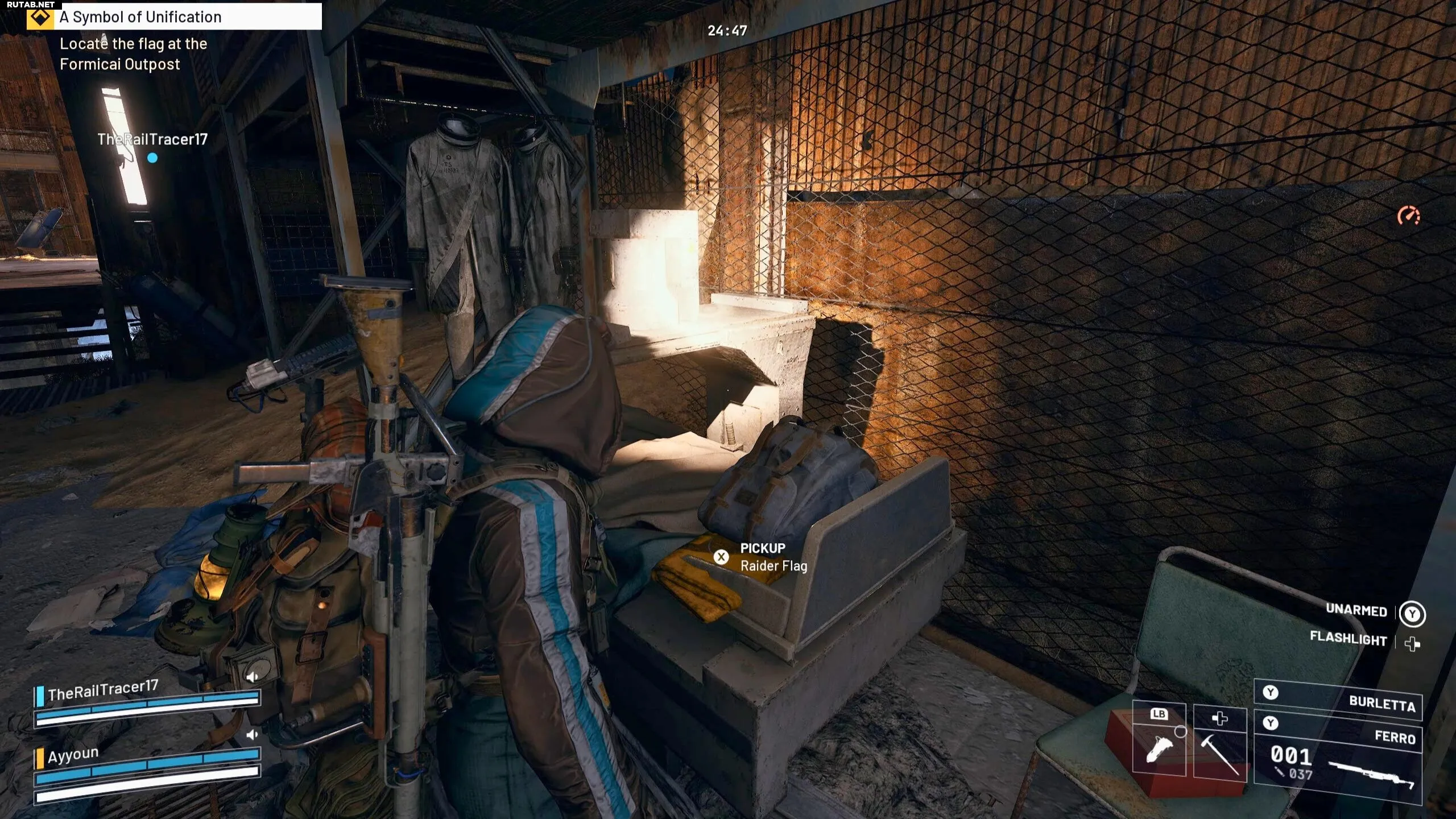 Попав в аванпост с тыльной стороны, справа вы найдете кровать с желтым рюкзаком. Обыщите рюкзак, чтобы достать флаг рейдеров. Это выполнит вторую цель квеста.