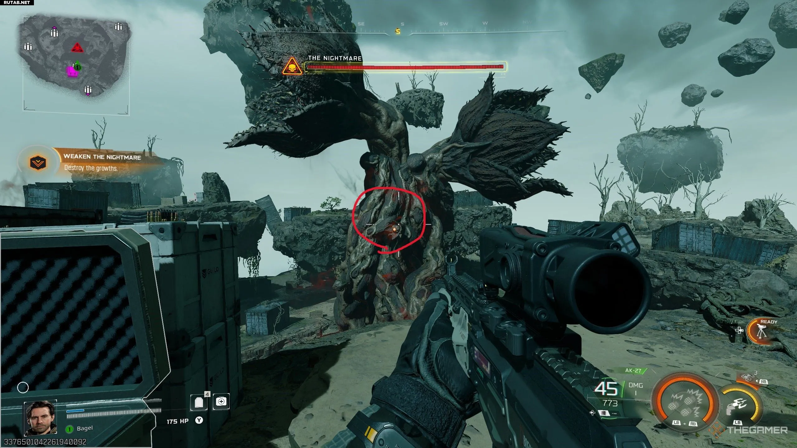 Кошмар — гигантское растение, устойчивое к урону в большинстве мест. В начале боя сосредоточьте огонь на маленьких цветочных почках, разбросанных по его стеблю. Уничтожение этих почек наносит значительный урон.