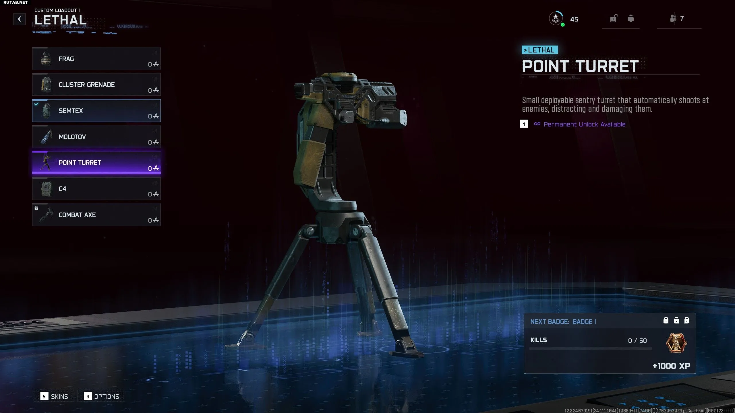 Турель — это небольшая разворачиваемая турель, которая автоматически стреляет по врагам после броска. Она может отвлекать и наносить урон зомби, однако её эффективность довольно ограничена. Скорее она создаст неудобства и вам, и зомби, чем станет действительно полезным снаряжением. Турель наносит посредственный урон, что может нарушать ваши тактики — она пытается проредить толпу зомби, вынуждая появляться новых. Лучше избегать использования турели: хотя концепция интересна и может быть полезна в мультиплеере, против зомби существуют гораздо более эффективные способы уничтожения больших групп.