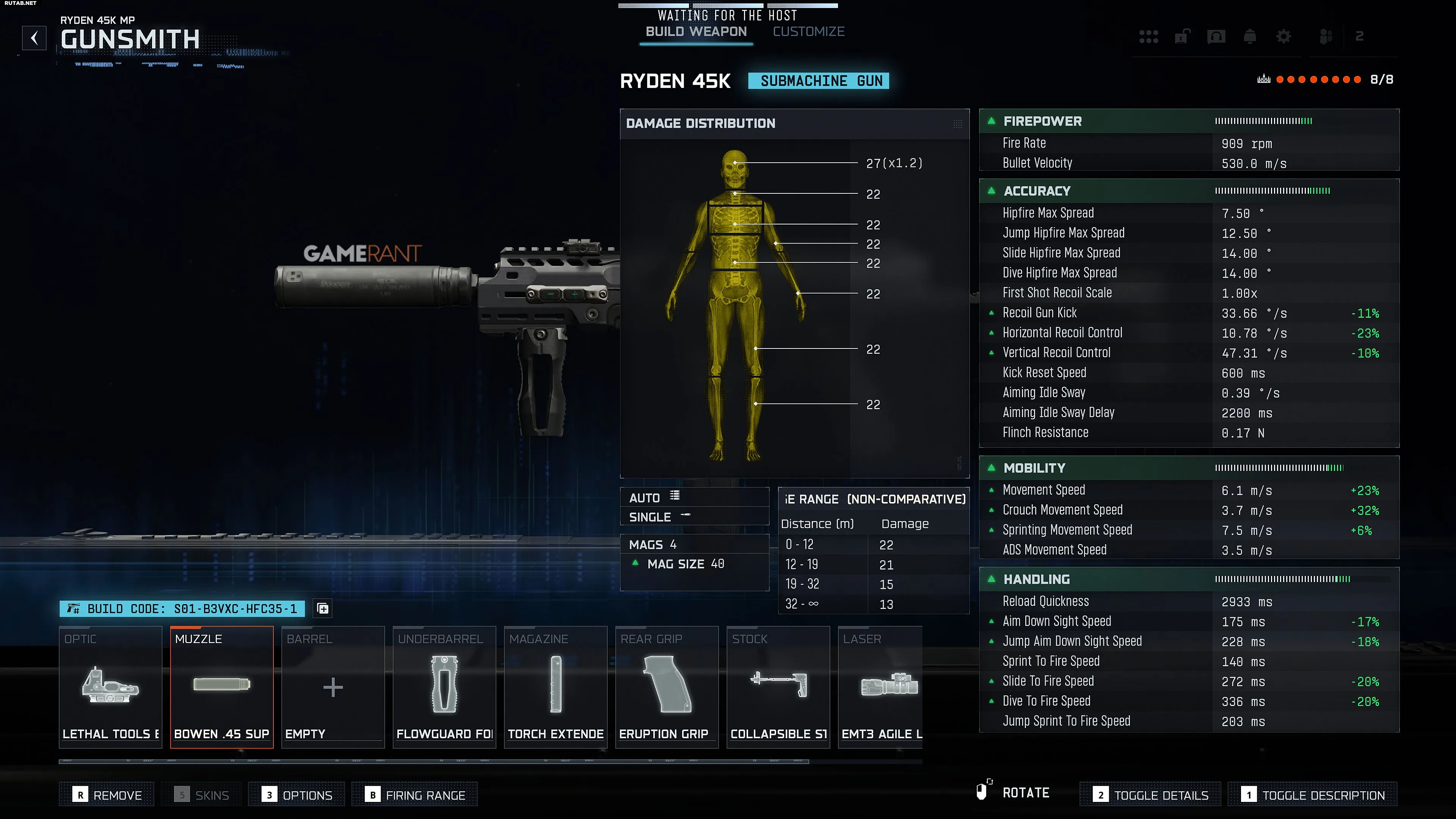 Ryden 45K — это ПП, созданный для ближнего боя. С скорострельностью 909 выстрелов в минуту он обеспечивает очень быстрое время убийства в пределах 10 метров. Однако у оружия заметная отдача по вертикали и «гуляние» ствола по горизонтали, которые требуют контроля.