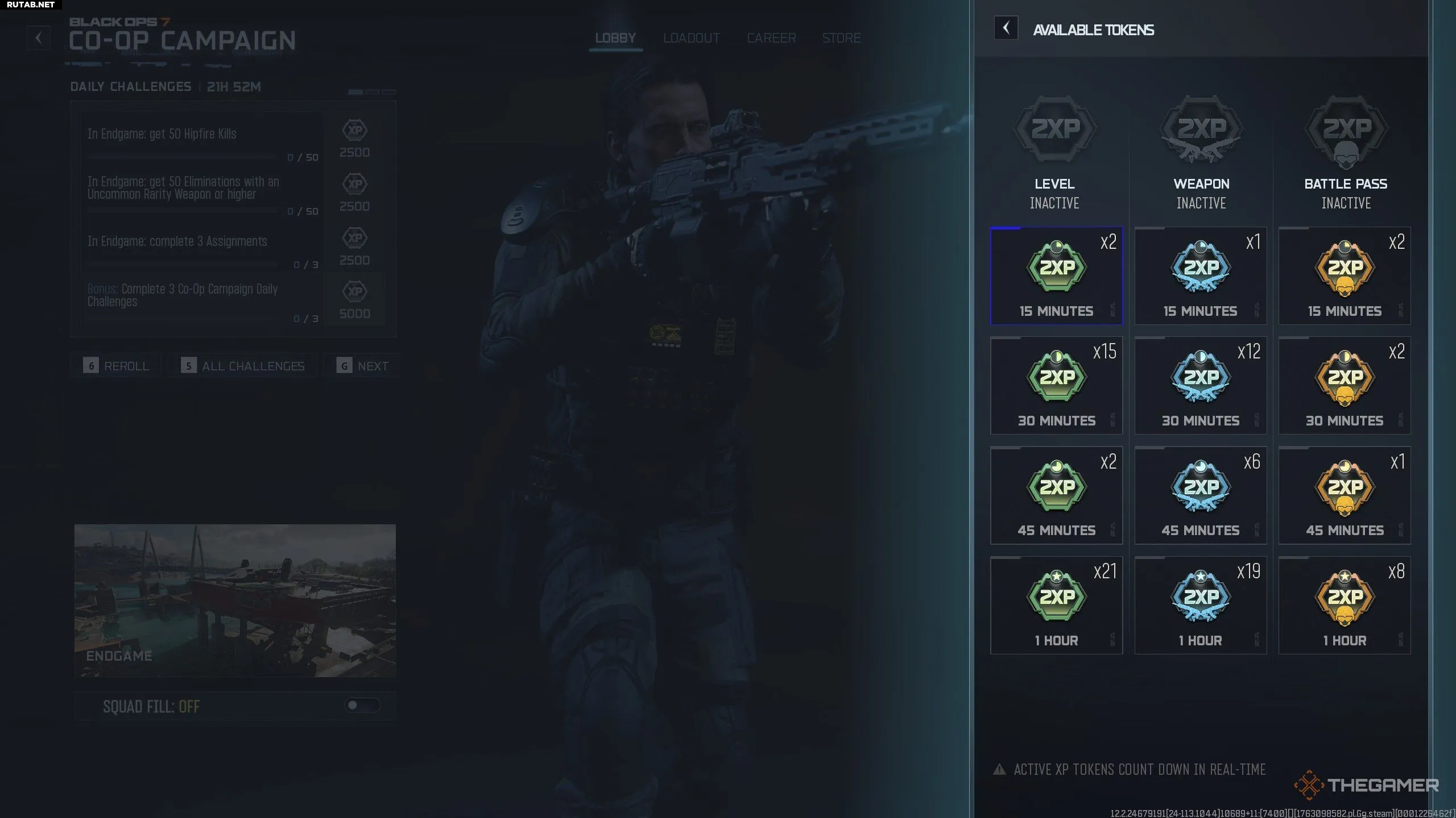 Доступ к жетонам двойного опыта осуществляется нажатием клавиши 3 на клавиатуре или L3 на контроллере. Существует три типа жетонов (уровень, оружие и боевой пропуск). Если вы читаете это в момент запуска игры, боевой пропуск ещё не вышел, поэтому сосредоточьтесь на использовании первых двух типов, а жетоны для боевого пропуска приберегите до его появления.