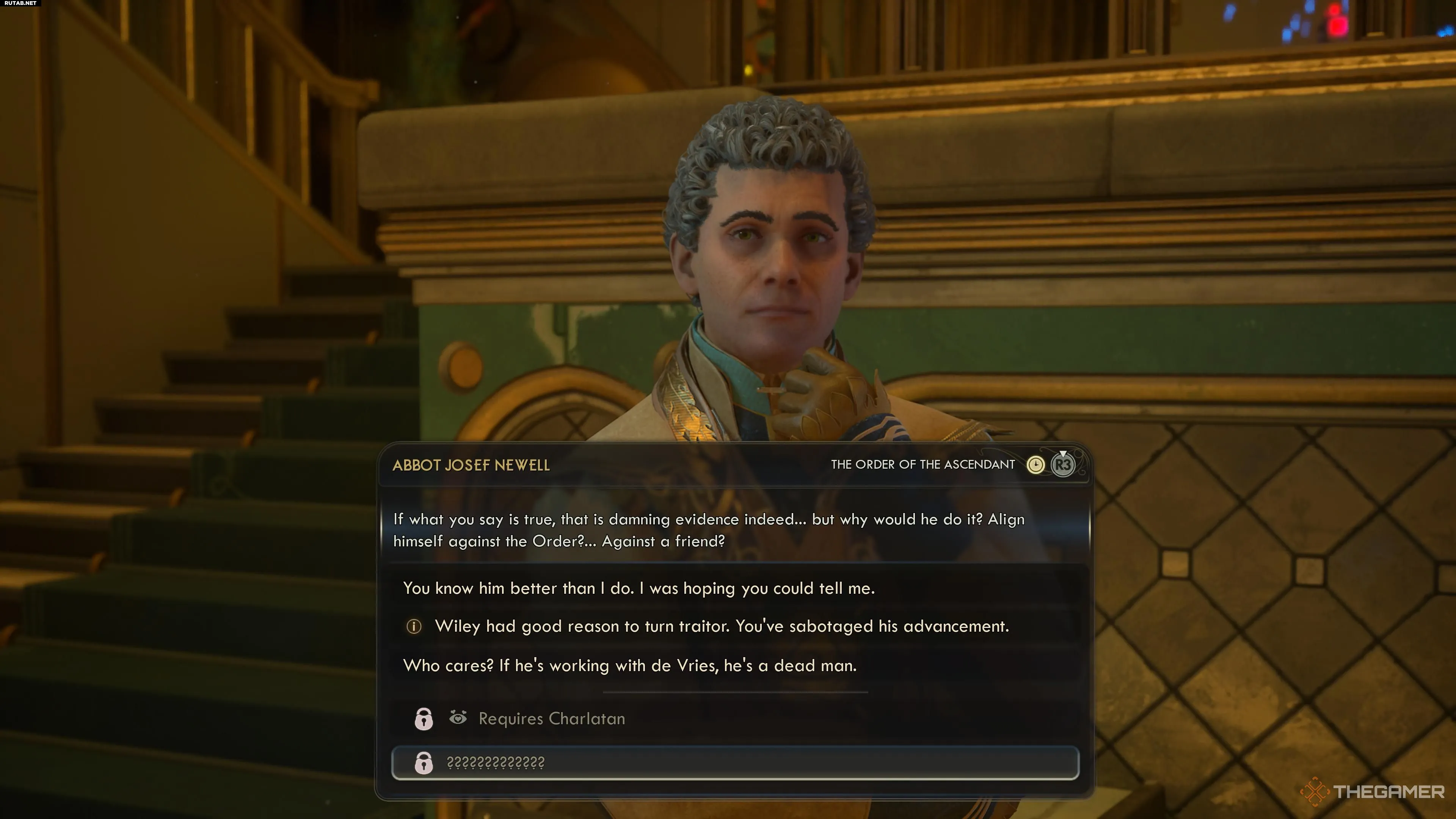 Если вы попытаетесь выведать секрет у аббата, но не сможете заставить его поделиться с вами, он сам раскроет его вам после того, как вы разберётесь с Уайли.