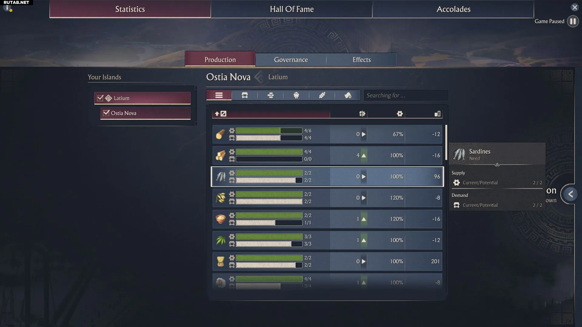 Например, на изображении выше город производит 2/2 сардин, но потребляет меньше двух. Это означает, что на острове достаточно сардин, однако если рабочая сила увеличится, игрокам потребуется построить дополнительные рыбацкие хижины.