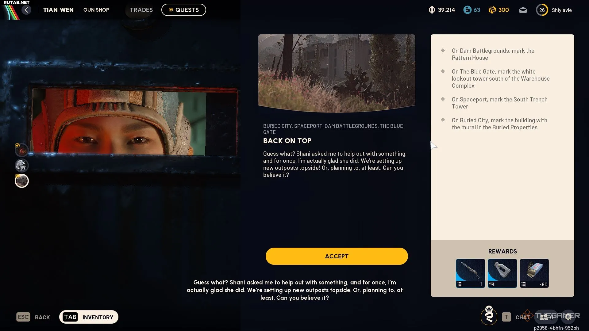 После того как вы отметили все четыре сооружения для Тянь Вэнь, вернитесь назад, чтобы завершить квест. Вашими наградами станут редкое огнестрельное оружие, патроны среднего калибра и редкая модификация оружия, которую вы сможете использовать для улучшения своей экипировки!