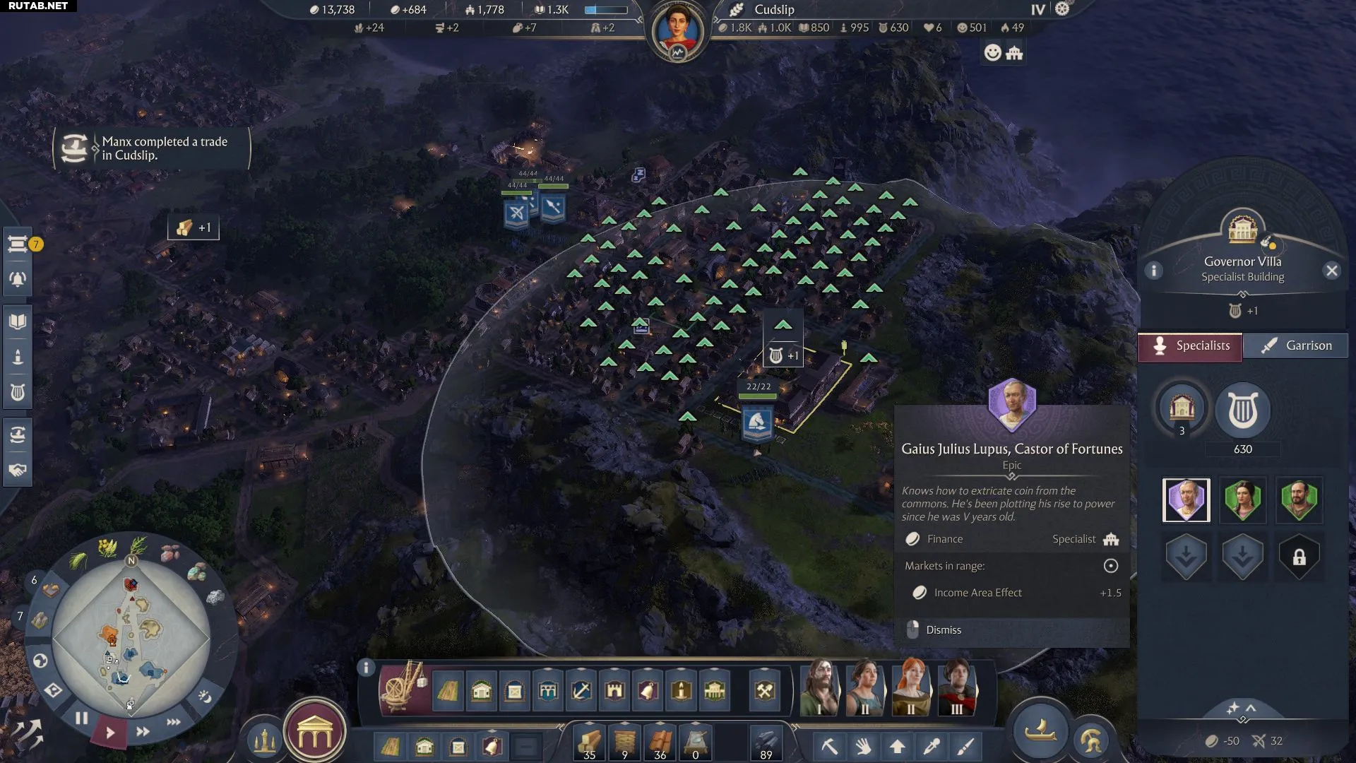 Некоторые специалисты в Anno 117: Pax Romana могут помочь увеличить доход. Например, Гай Юлий Луп увеличивает зональный эффект дохода от рынков в радиусе действия. Получить Гая можно в событии «Близнецы в глуши», где нужно сделать выбор между Гаем и Брутом.