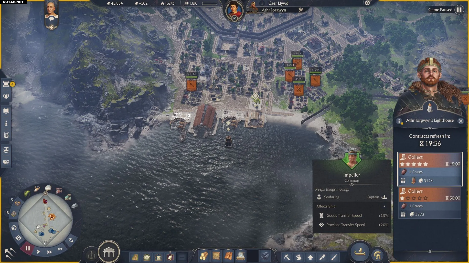 Игроки также могут зарабатывать денарии в Anno 117: Pax Romana через торговлю. Посетив гавань другого города, можно увидеть товары, которые там покупают. Например, в кампании Кнокнис из Альбиона всегда покупает тростниковую обувь за 21 золотую монету.
