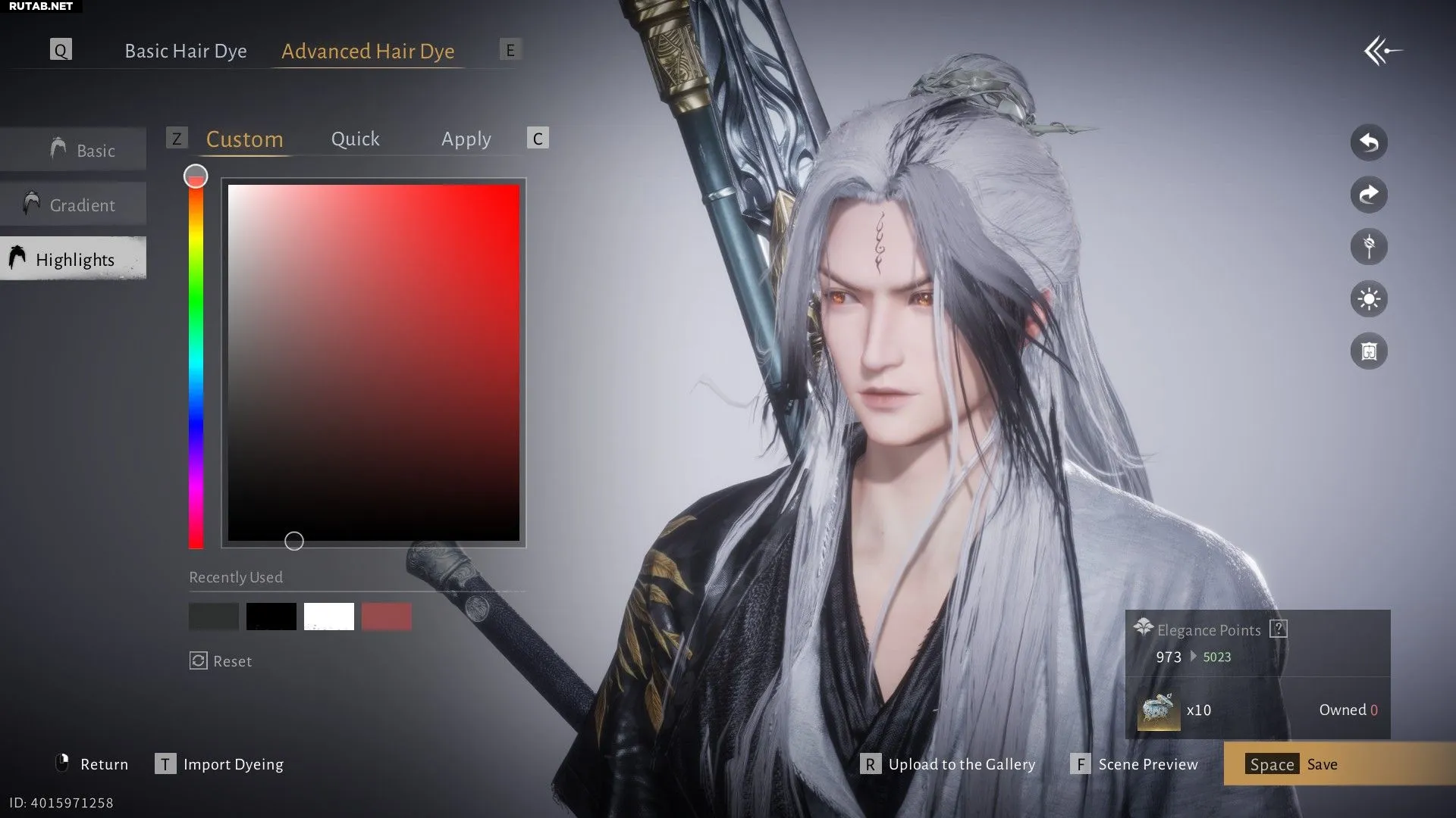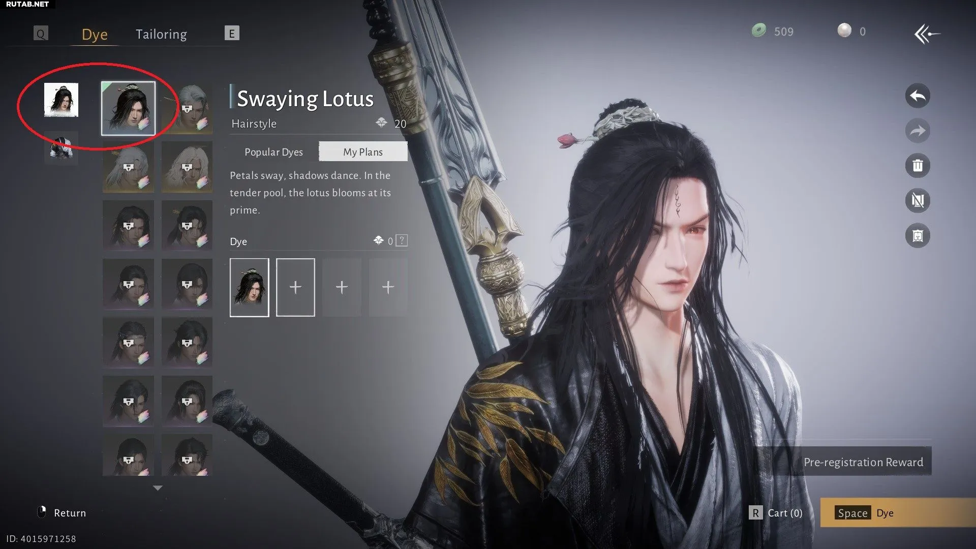 В меню «Внешность» перейдите в раздел «Мастерская» → опция «Окрашивание». Выберите прическу для окрашивания, затем один из пустых слотов для красителя. Доступно два типа окрашивания: