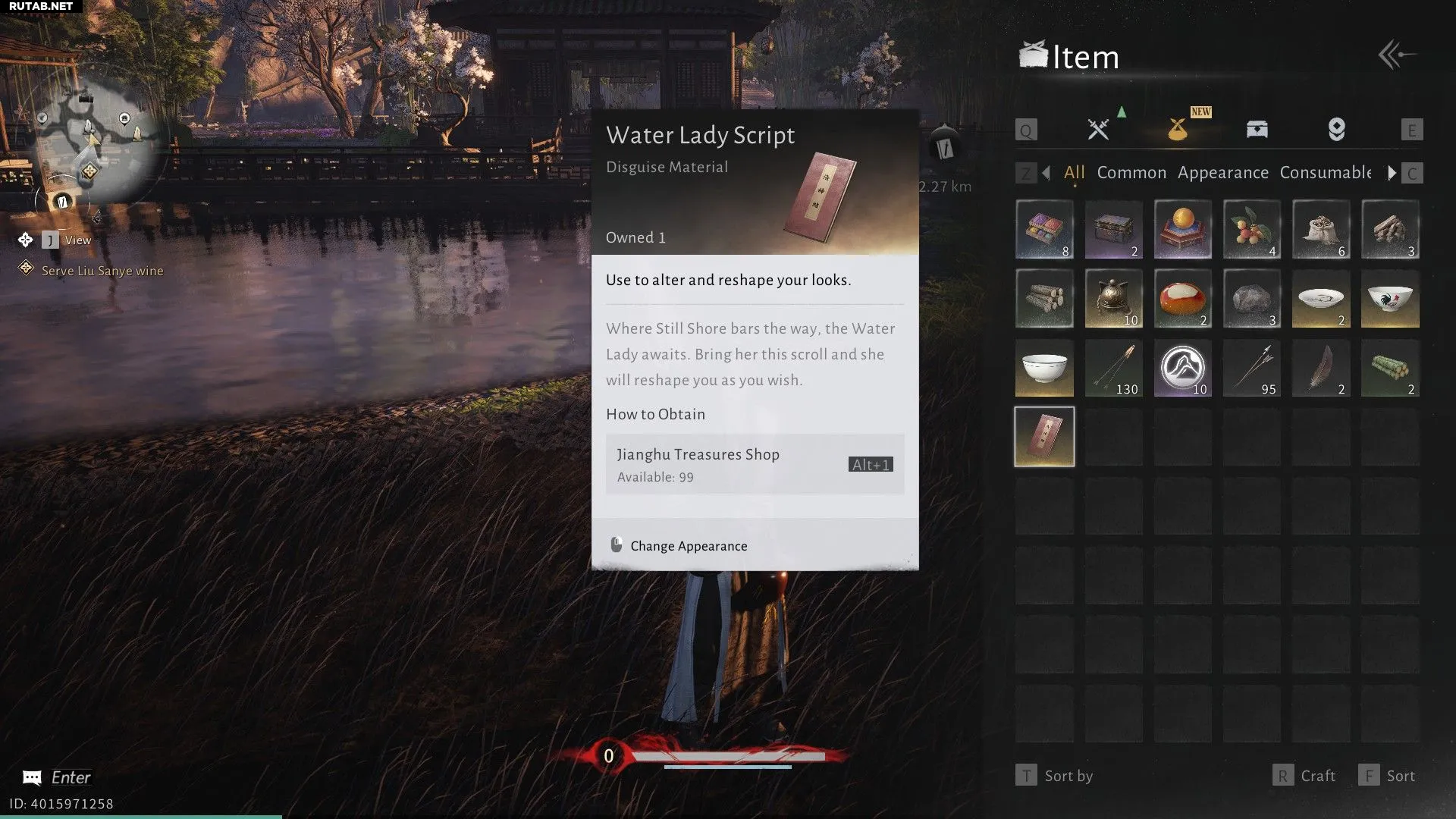 Для изменения физических параметров персонажа потребуется предмет «Свиток Водяной леди». Откройте рюкзак → раздел «Предметы» или в меню «Внешность» нажмите кнопку «Внешность» в левом нижнем углу экрана под оружием.