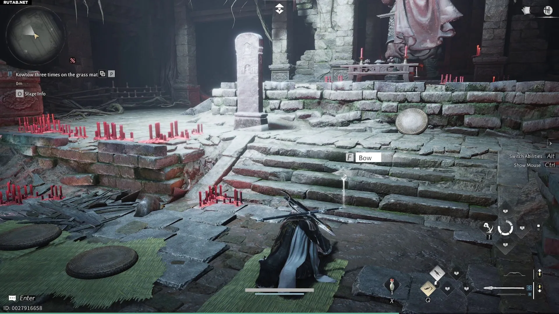 Чтобы поклониться, подойдите к циновке, пока не появится подсказка «Поклон». Нажмите клавишу взаимодействия (F/R2) для начала действия. Появится шкала прогресса, показывающая длительность анимации.