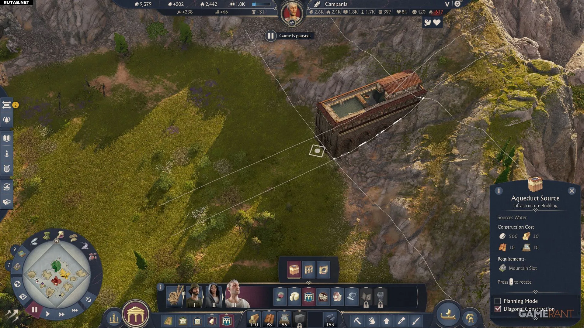 Источник акведука можно разместить только в горном слоте — эти места подсвечиваются при выборе расположения. Поскольку эти же слоты используются для известняковых карьеров и железных рудников, следите, чтобы не заняли все доступные места.