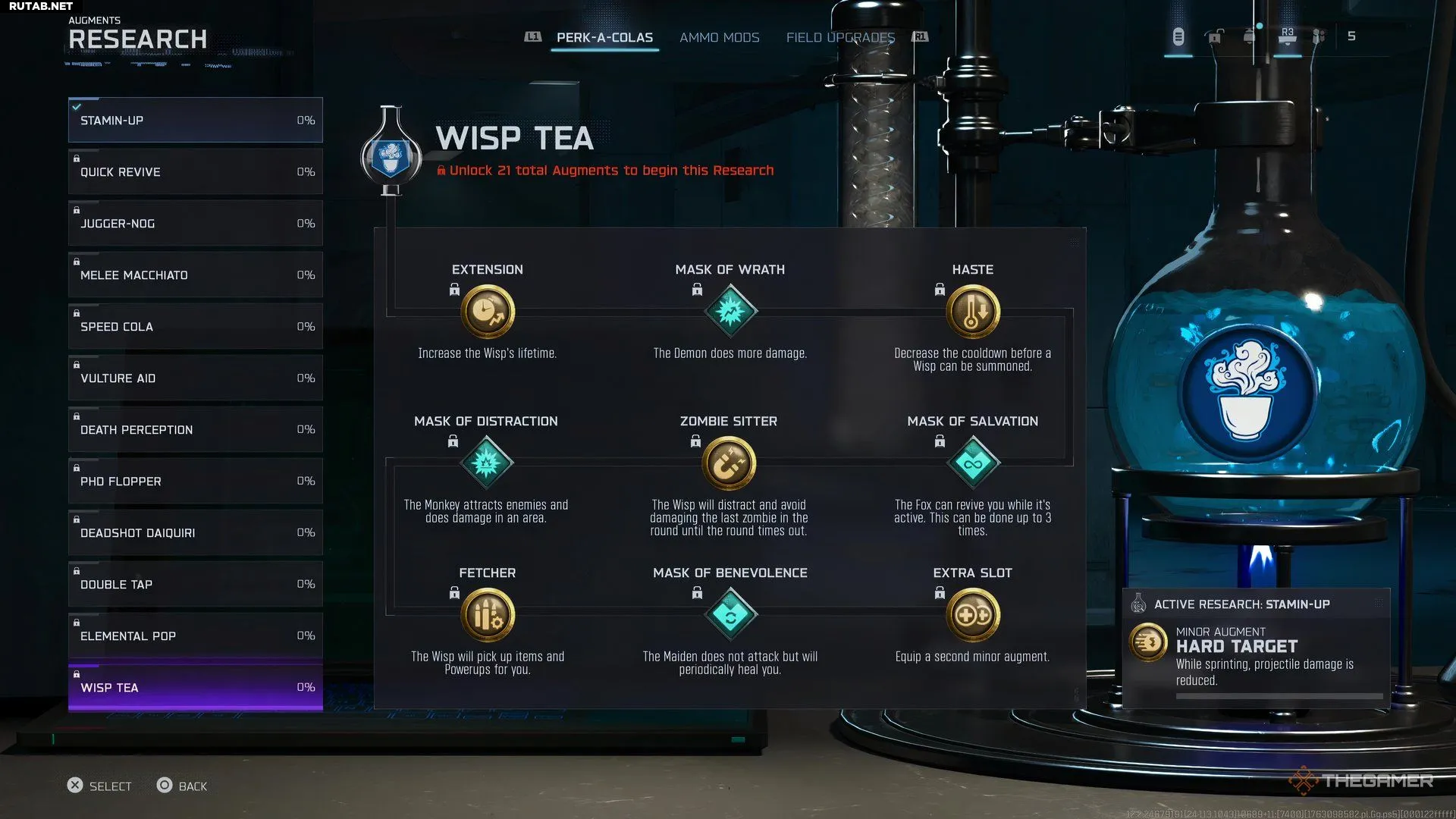 В Black Ops 7 доступно 12 перков, включая новый Wisp Tea. Схема исследования для каждого перка становится доступной после завершения определённого общего количества аугментов в любой категории: