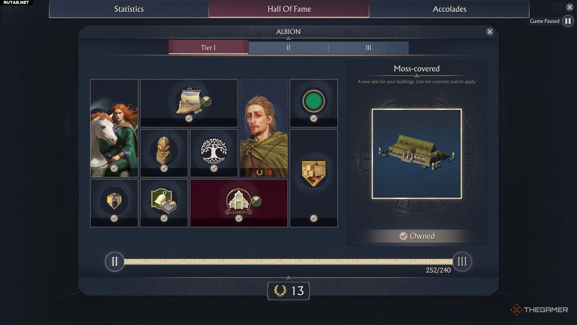 В настоящее время существует два уровня наград в Зале Славы: Лаций и Альбион. Награды в каждом из них соответствуют римлянам (Лаций) и кельтам (Альбион) и стоят разное количество очков Славы, обычно от 15 до 75. Чтобы разблокировать следующий уровень наград, нужно потратить очки Славы.