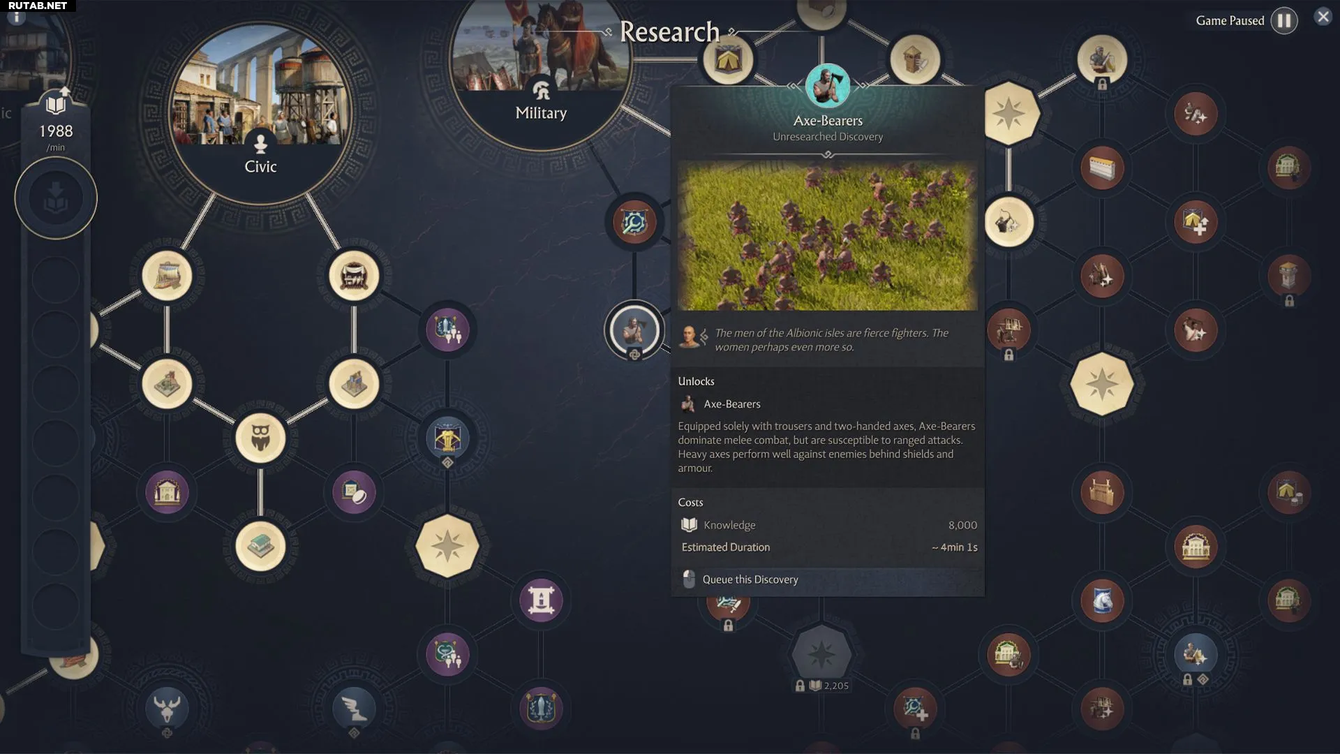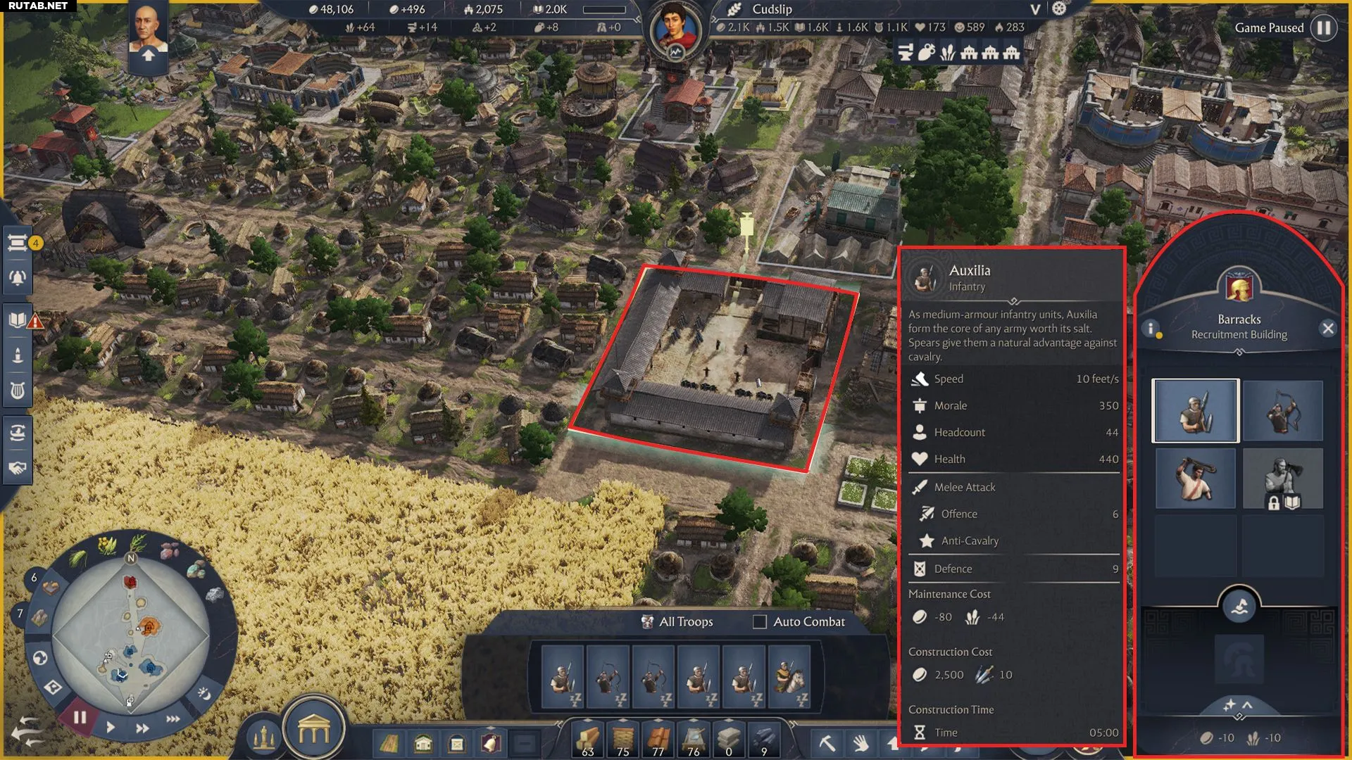 Набор войск становится доступен после постройки Казармы. Изначально можно нанимать вспомогательные войска (Auxilia) и лучников.