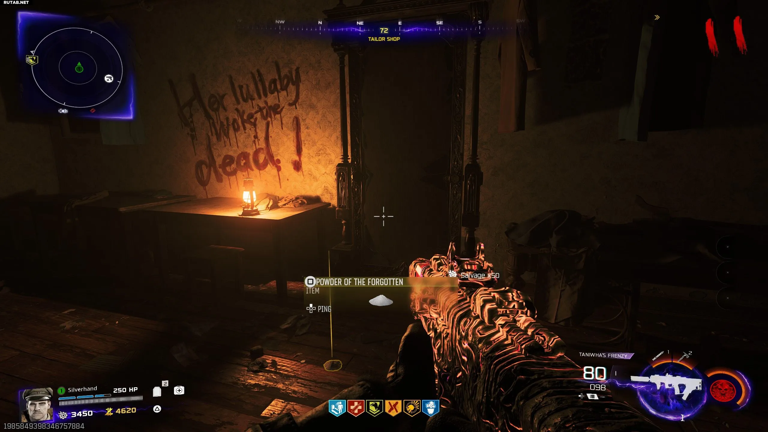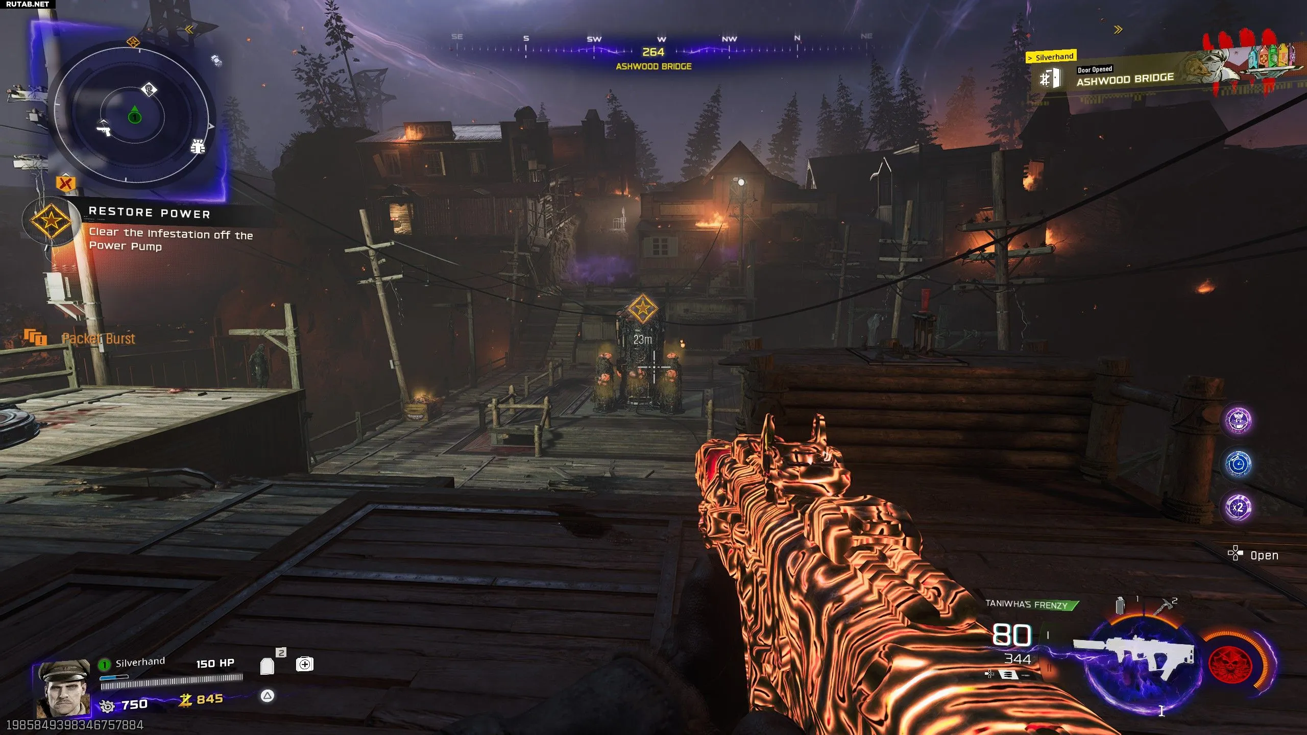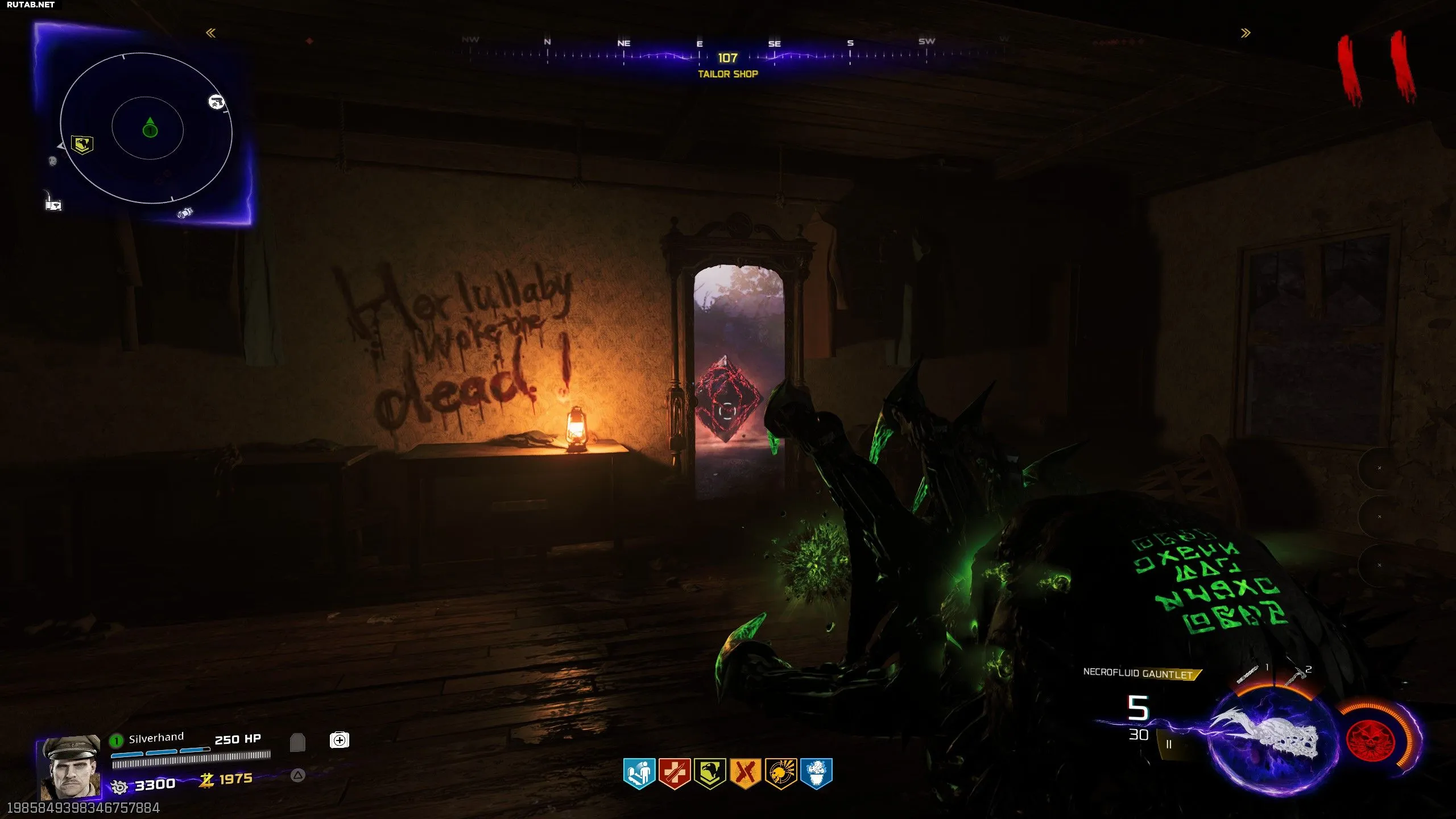 В Эшвуде выстрелите из Ствола турели DG-2 Олда Тесси в часовую башню, затем выстрелите в заряженную башню из Перчатки Некрожидкости и перезарядитесь, чтобы наполниться фиолетовой энергией. Теперь направляйтесь в фермерский дом на ферме Вандорн. На юго-западной стене дома вы найдёте часы, показывающие время. Вокруг обеденного стола с трупами вам нужно встать на выгравированные римские цифры, соответствующие времени на часах (в нашем случае часы показывали полночь, поэтому символом было XII за спиной отца). Стояние на правильном символе заставит голову отца повернуться, и когда его глаза станут красными, вам нужно будет выстрелить в него заряженной фиолетовой Перчаткой Некрожидкости.