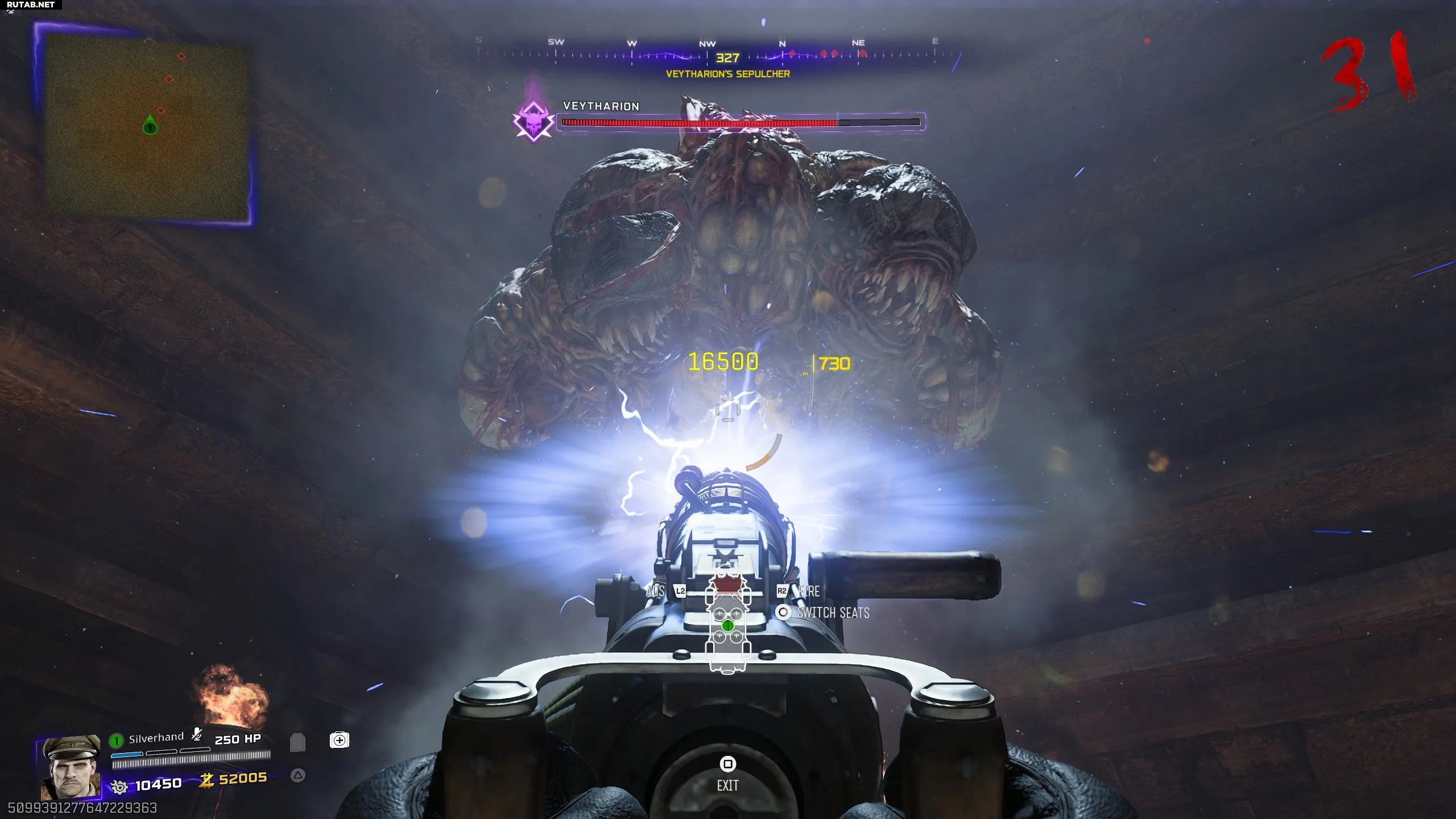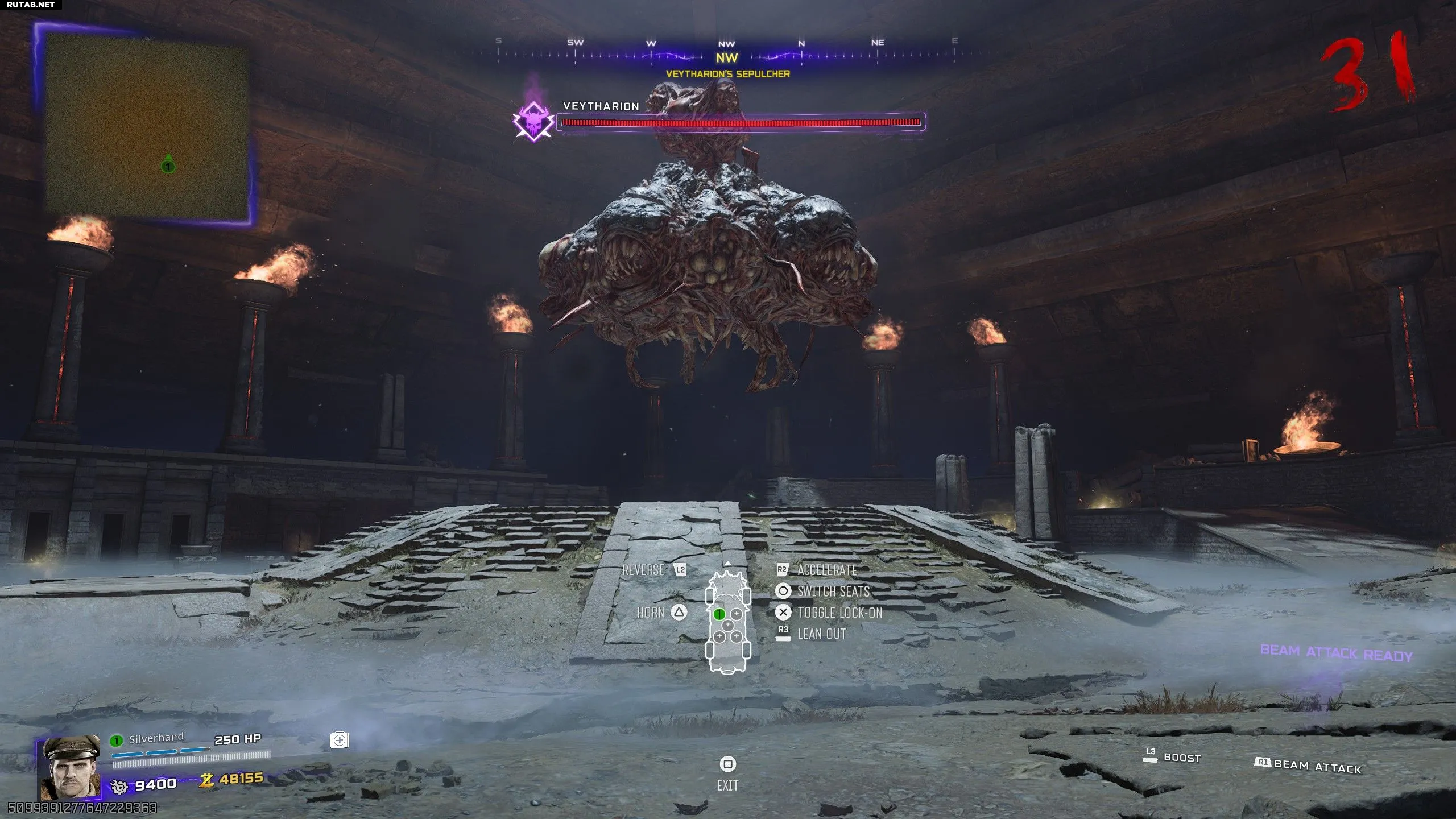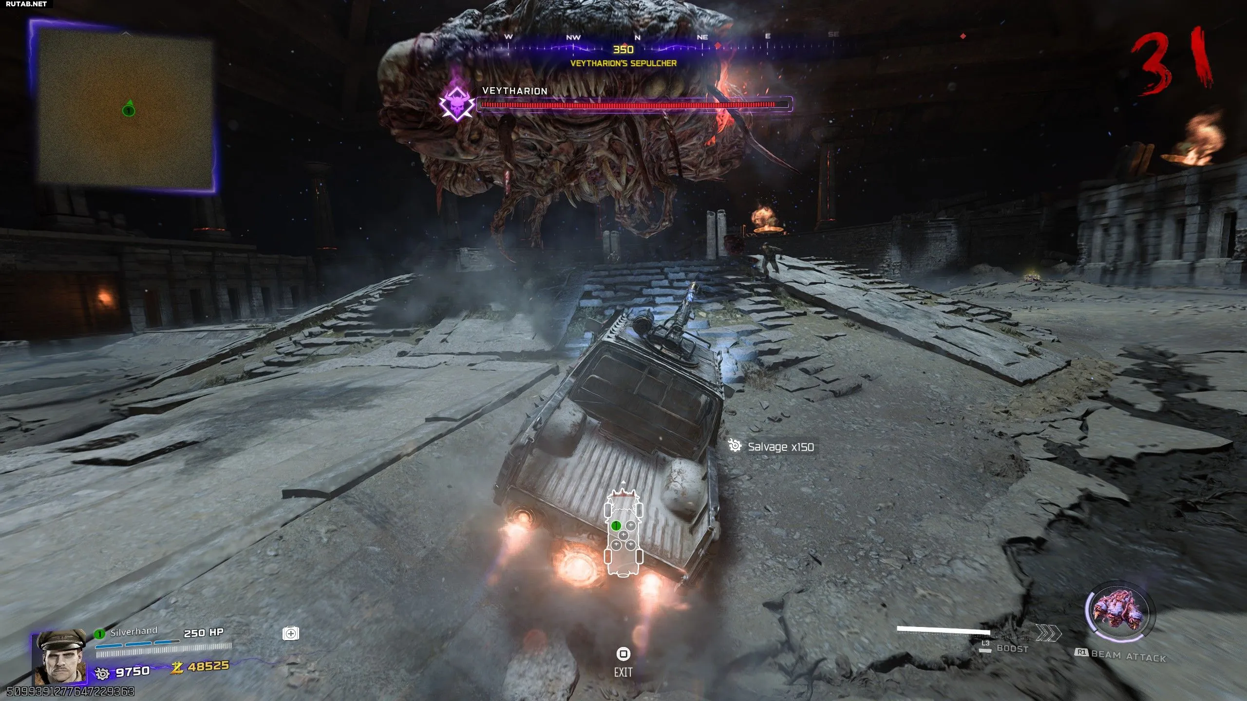 Вейтарион иногда становится неуязвимым. Чтобы нанести ему урон в этот момент, нужно протаранить его Олдом Тесси, собрать луч света, а затем снова таранить, будучи заряженным этим лучом. Наиболее эффективная тактика — комбинировать тараны Олда Тесси с выстрелами в светящиеся части босса из Ствола турели DG-2 или использовать Перчатку Некрожидкости. Особенно опасайтесь красных ракет — они могут нанести смертельный урон как вам, так и Олду Тесси. После победы над Вейтарионом пасхалка будет завершена. Поздравляем!
