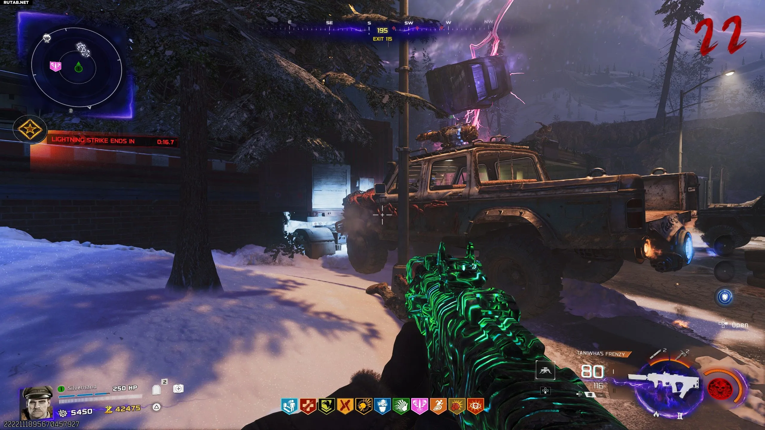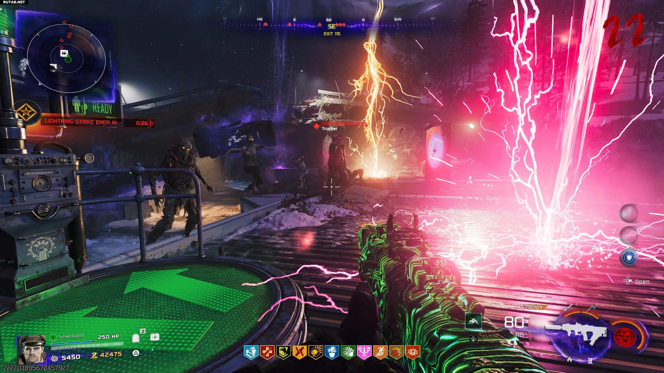 Если молнии возникают вокруг крыш Выхода 115, вам нужно активировать три души на карте и направить их к соответствующим вспышкам молний. Чтобы вызвать души, необходимо выстрелить из Перчатки Некрожидкости в фиолетовом режиме в юго-западные часы на крыше заправочной станции. После выстрела у вас будет 60 секунд, чтобы найти и освободить три души. Это сложная задача, которая может потребовать несколько попыток. Рекомендуем освобождать по одной душе за раз и возвращаться сюда в фазы молний — активировать часы в Выходе 115 можно только один раз за раунд, но освобождённые души остаются свободными, поэтому не нужно повторять уже выполненные этапы: