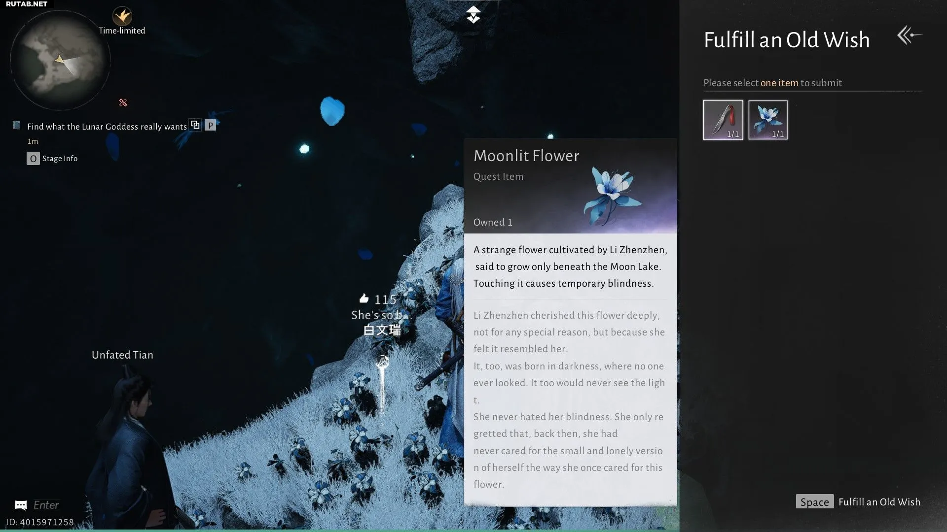 Вернувшись к Лунной Богине, вы можете предложить ей либо Лунный Цветок, либо Небольшой клинок. В нашем прохождении мы выбрали цветок. После этого начнётся кат-сцена, и квест завершится. Покинуть святилище можно, вернувшись в покои Ли Чжэньчжэнь и пройдя через узкий проход в стене.