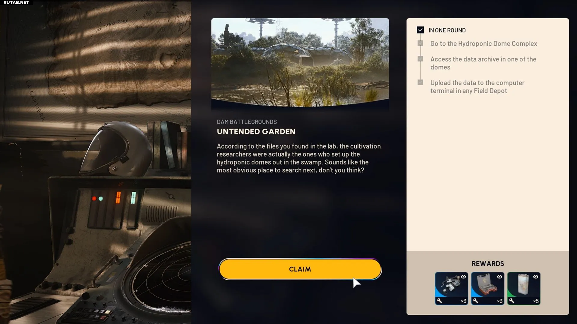 Первая цель квеста — добраться до Гидропонного купольного комплекса. Это важная зона на севере карты «Поля сражений у Дамбы». Достигнув комплекса, вы получите новое задание: получить доступ к архивным данным в одном из куполов. Нужный купол находится на северо-западе, над символом «Природа».