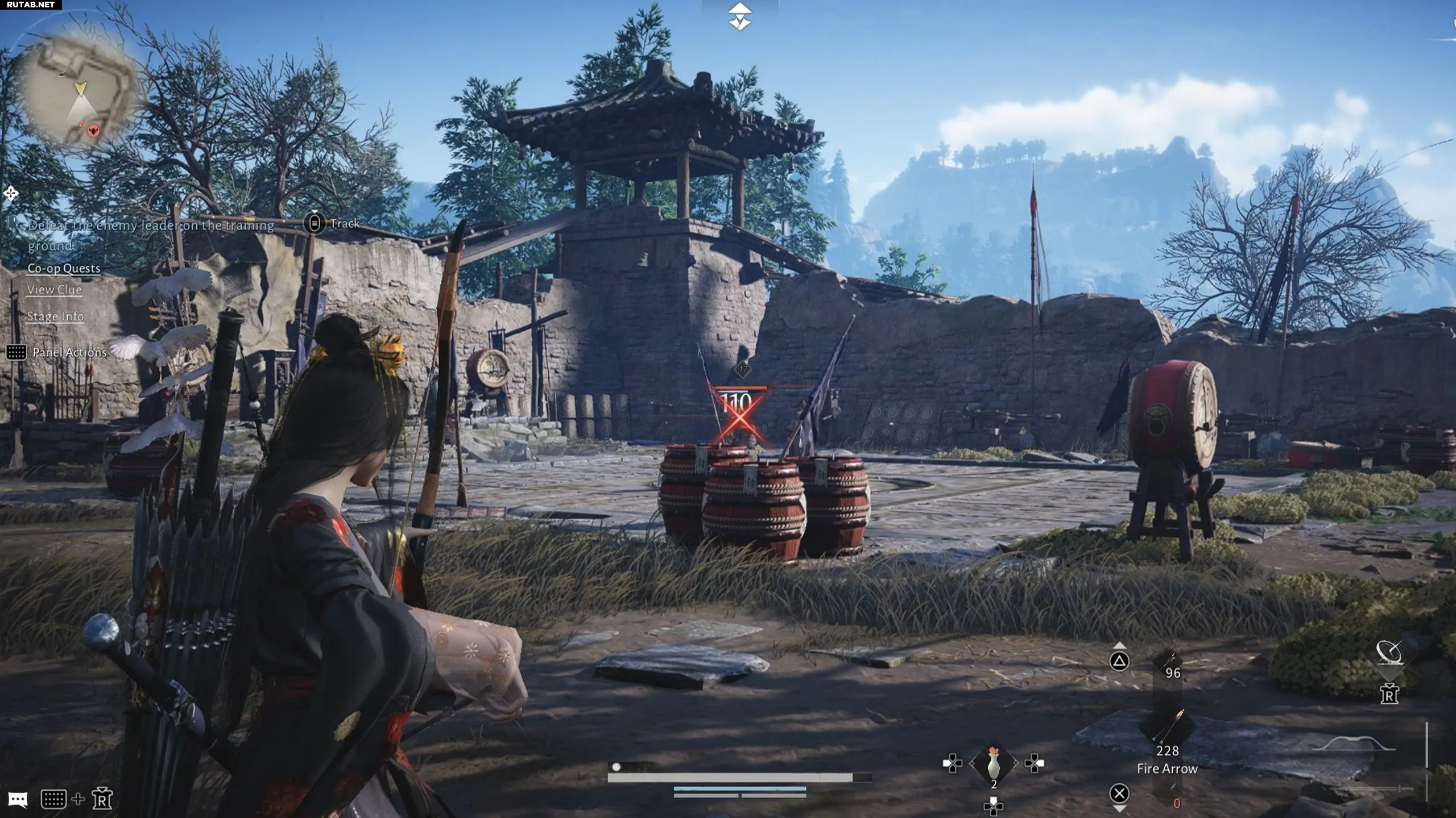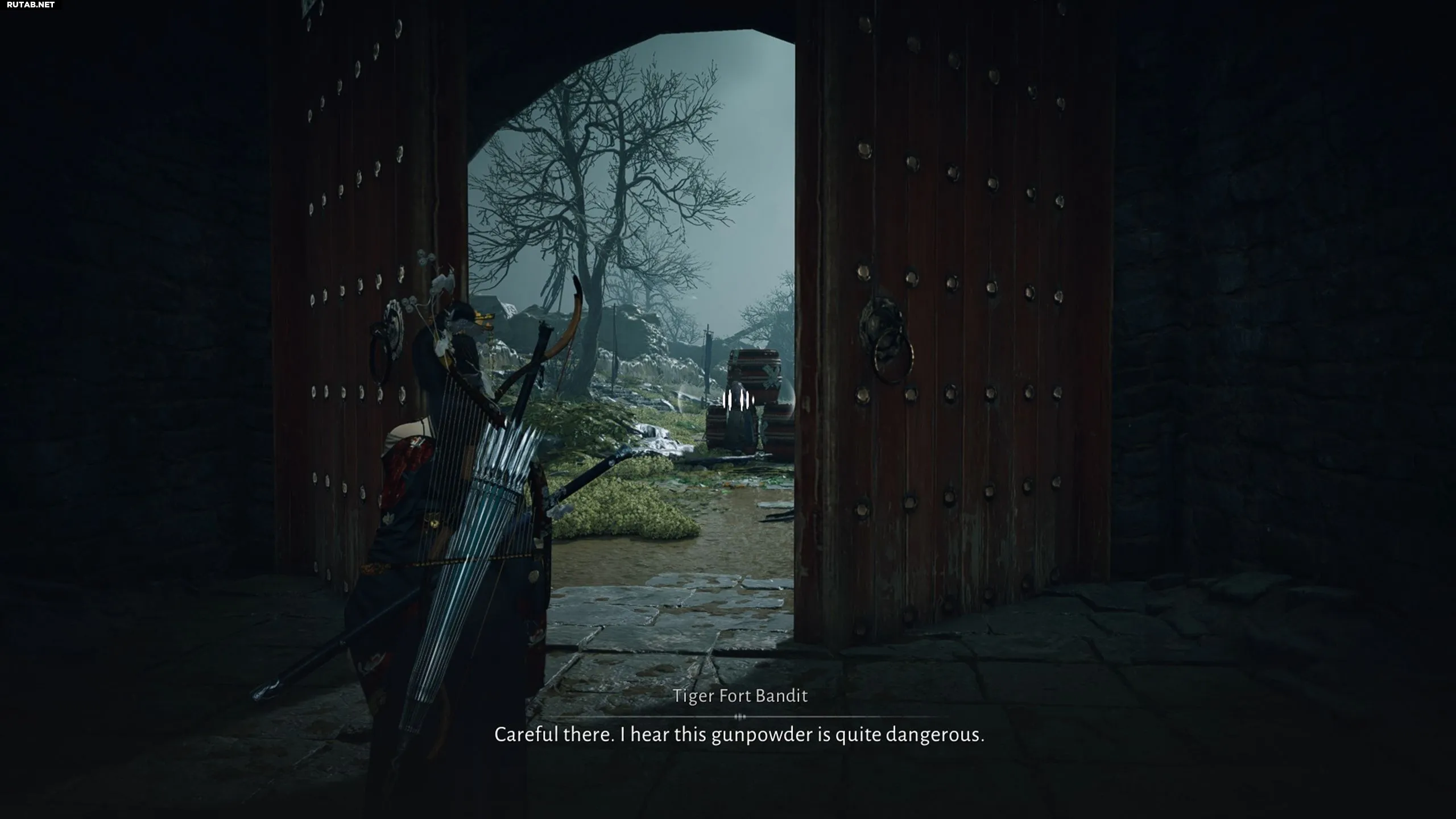 Войдите в разрушенный замок, где обнаружите бандитов рядом с бочками взрывчатки. Можно подслушать их разговор, а затем поджечь бочки огненной стрелой.