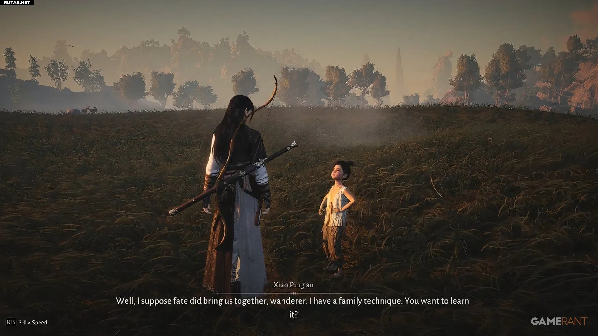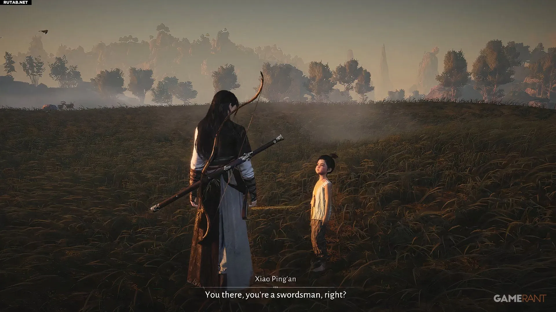 Уничтожьте врагов — появится цель «Найти ребенка, наблюдающего за битвой». Он находится к северу от лагеря. Мальчик Сяо Пинъань предложит изучить боевое искусство, но сначала попросит продемонстрировать Устрашающий удар Безымянного меча.