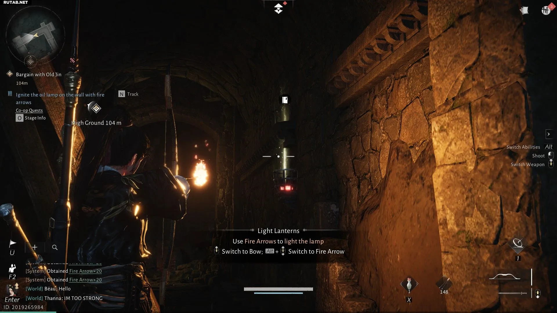 Продолжайте движение вперёд и соберите колчаны из открытого сундука — в них находится около 120 огненных стрел. Они понадобятся для решения головоломок в этом подземелье. Чтобы продвинуться дальше, натяните лук, выберите огненные стрелы (зажмите Alt и прокрутите колёсико мыши с натянутым луком) и подожгите заросшие кусты огненной стрелой, чтобы открыть путь.