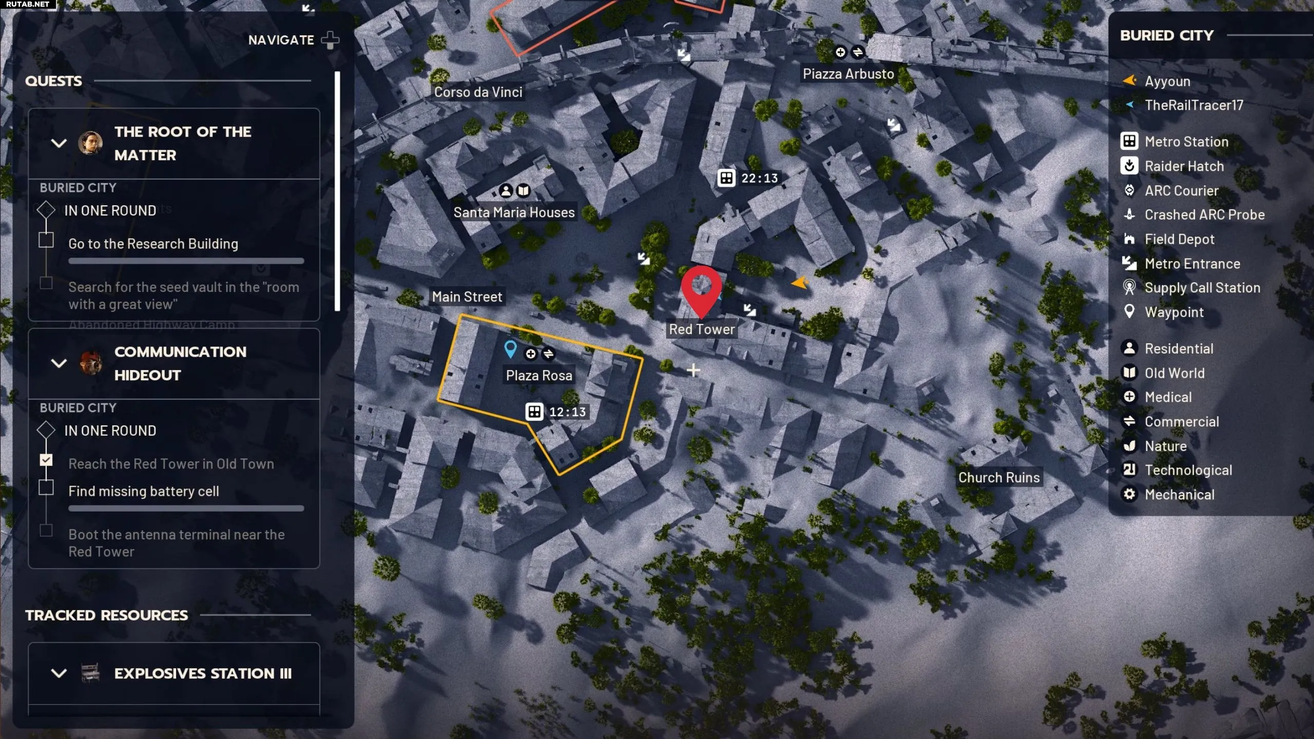 Чтобы начать квест «Убежище связи», направляйтесь к ориентиру Красная башня на карте «Засыпанный город». Этот район находится к северо-востоку от здания Плаза Роса — приблизьте карту на один уровень, чтобы увидеть его.