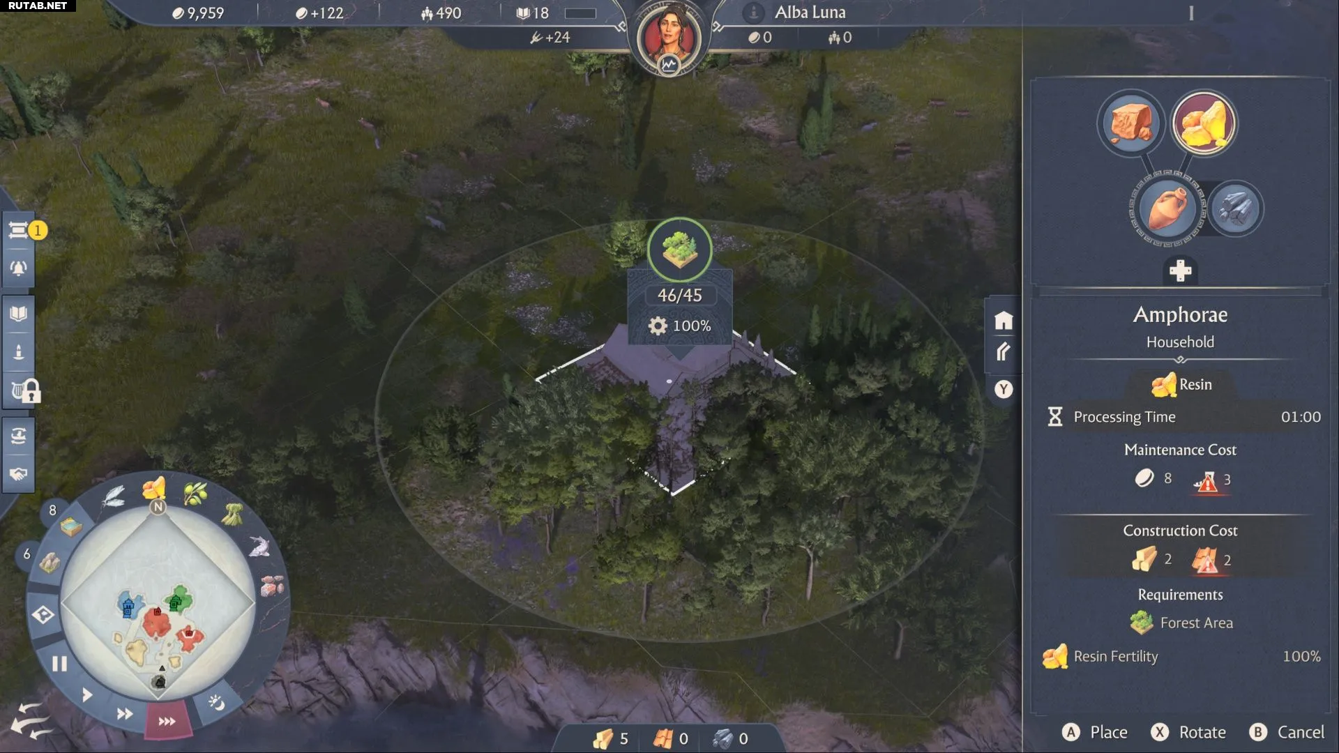 Найдя подходящий остров, можно приступать к строительству производства. Для этого потребуется 3 плебея. Для постройки здания нужны 2 единицы древесины и 2 черепицы. Для достижения 100% производительности разместите производство смолы в лесной зоне с 45 деревьями. Техобслуживание здания обойдется в 8 денариев.