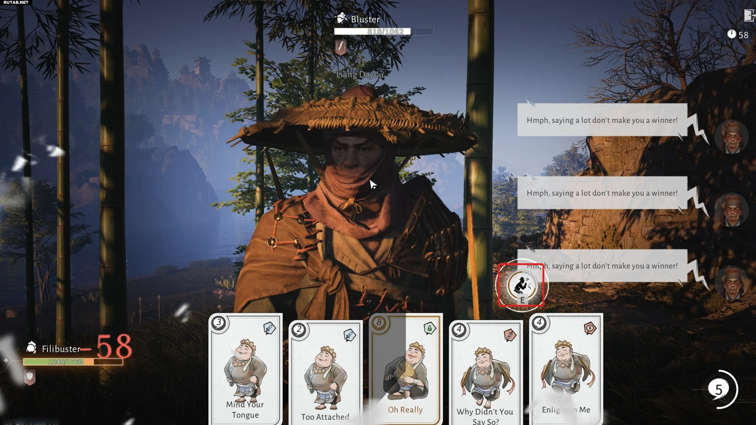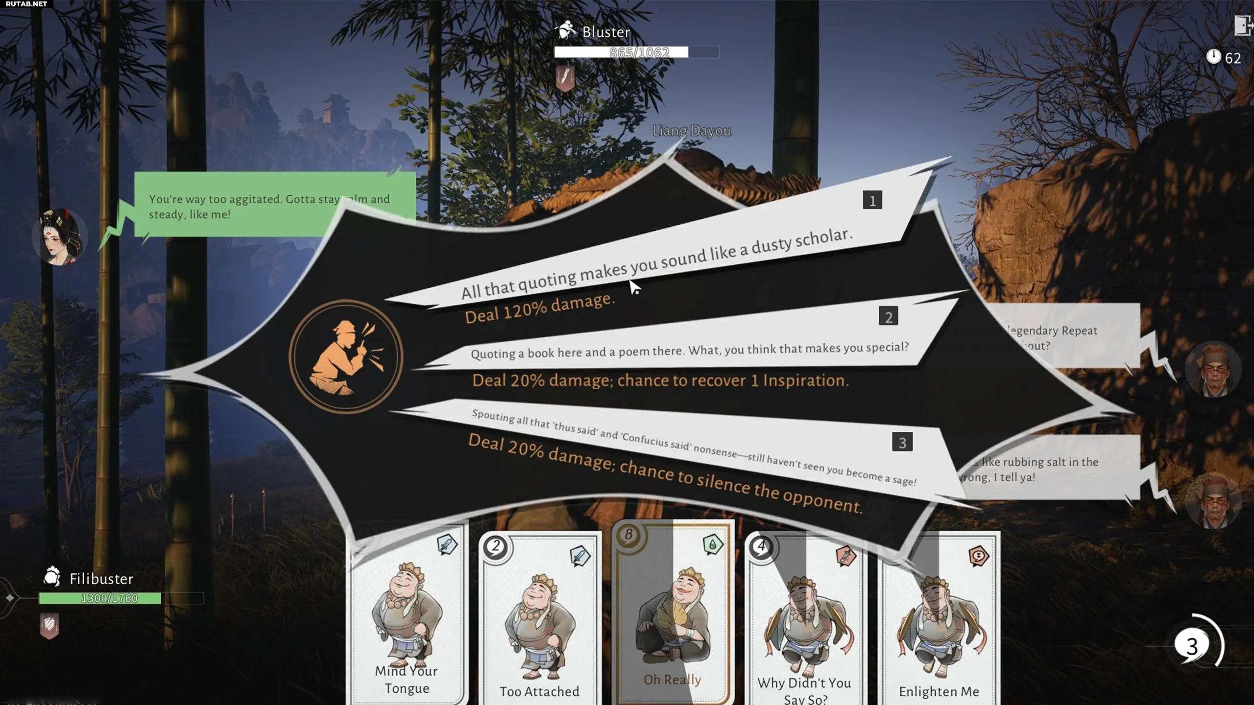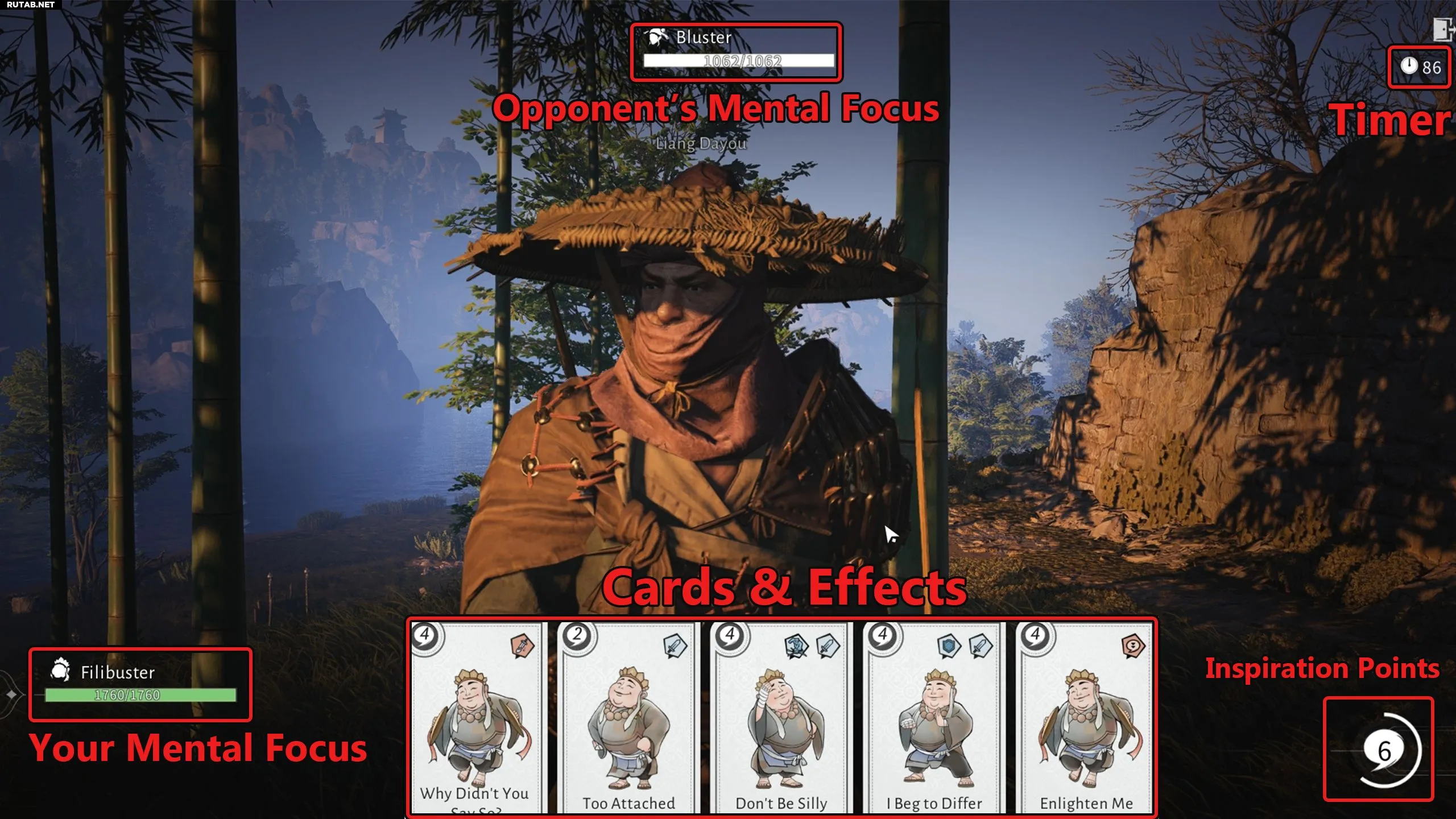 Цель «Дара красноречия» — снизить ментальноеFocus оппонента до нуля с помощью карт. Ваша шкала расположена слева внизу, а вражеская — сверху по центру. Карты обладают разными эффектами: усиливают атаку/защиту, оглушают противника, восстанавливают фокус и т.д.